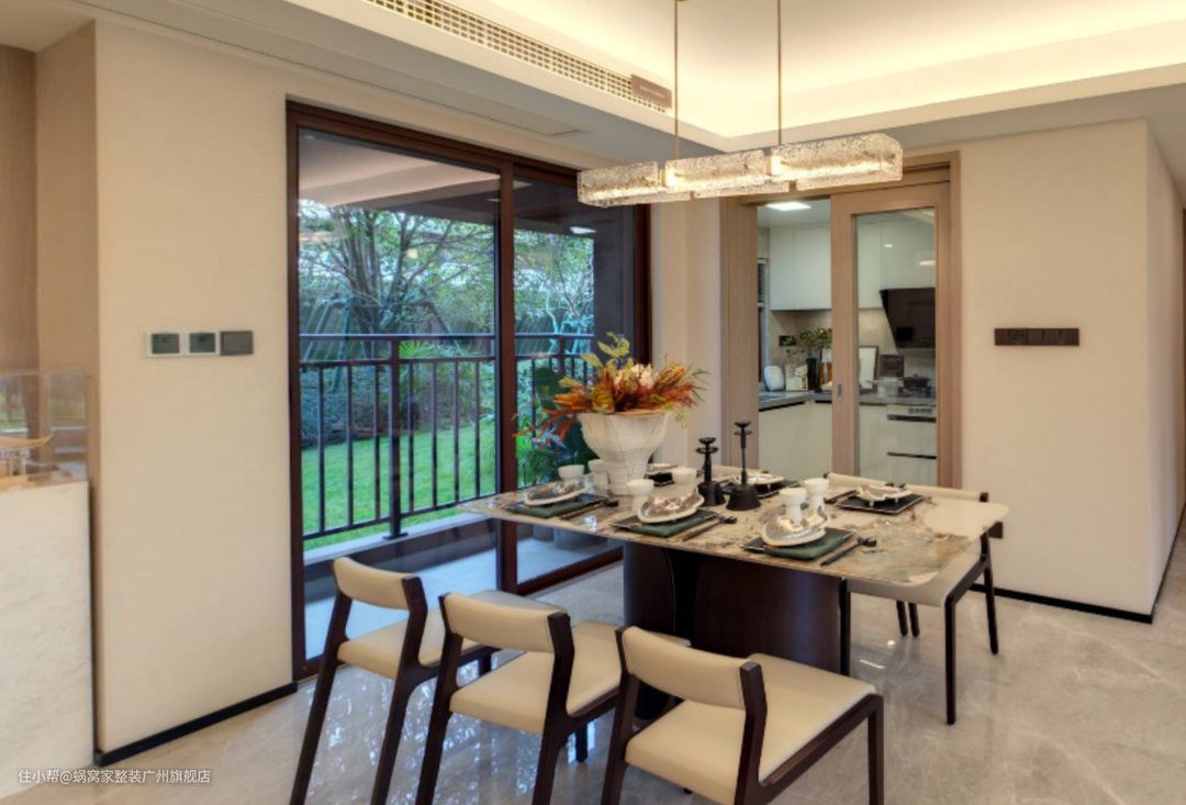 餐厅的另一边设计也是别出心裁,巧妙地将厨房和阳台与用餐区域紧密相连。坐在餐桌的另一边,不仅可以享受到美食的美味,还能时刻感受到厨房的忙碌与生活的气息。阳台的开放空间为餐厅增添了一抹自然的清新,让用餐体验更加舒适惬意。