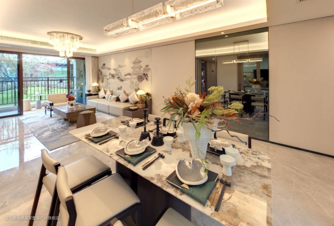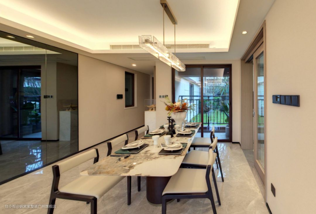 在这个宽敞明亮的居住空间中,餐厅与客厅的界限几乎消失,形成了一种独特的客餐厅一体化设计。这种布局不仅增强了空间的流动性,还使居住者能更方便地在家中的不同区域间穿梭。餐厅内,一张华丽的花纹大理石餐桌占据了中心位置,它以其独特的纹理和质感,为整个空间增添了一抹优雅与奢华。大理石台面不仅坚固耐用,还能在光线的照射下,散发出迷人的光泽,为餐厅营造出一种高贵而不失温馨的氛围。无论是家庭聚餐还是朋友聚会,这张餐桌都能成为空间中的焦点,让人们在享受美食的同时,也能感受到家的温馨与舒适。