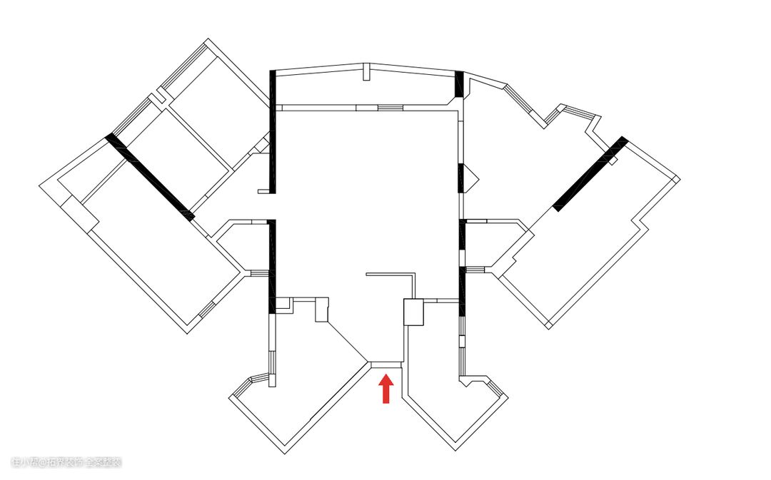 该案例常住人口有两人,他们都是艺术创作者;因工作的特殊情况,该房子要装修为居家和办公一体;两人都喜欢中式家具,有种历史韵味的古典美。 户型存在问题: 该户型结构比较特别,就像是一个蝴蝶,比较多倾斜角落;客餐厅和厨房的规划有点乱,没有被合理利用;居住人数少,空置出来的房间比较多。