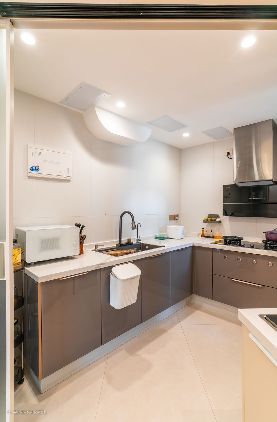 中厨区域使用三联动移门作为隔断,将空间开合到最大,打造更为大气开阔的格局空间;并设计三面橱柜,很好地发挥物品收纳的作用,多人共同下厨也不拥挤。