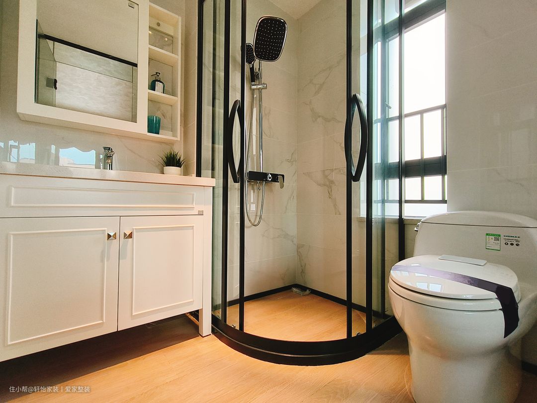 主卫抛弃一贯的镜柜设计,采用太空铝镜框,简约更出彩,高清镜面,保持平滑真实成像,不变形,加厚边框,结实耐用。整个空间呈现被细腻奶油包裹的温柔氛围,陶瓷一体台盆创造巧妙的收纳空间,高温烧制一体盆,釉面光滑易清洁,不易藏污耐垢,一抹就干净,加大防溅陶瓷盆,有效减少渗漏发霉。 黑色悬空式置物架轻松收纳,拒绝浴室脏、乱、臭,还你清爽浴室,高密度太空铝拒绝腐蚀生锈,合理间距设计,使用更顺手。黑色框的玻璃门隔开浴室和洗手区,实现干湿分离,保证卫生间的干燥洁净。 时尚精致的洗手台设计,适合小户型,节省空间,实用兼顾美观,镜柜大型储物空间,告别浴室杂乱,主柜大型储物空间告别浴室杂乱,抗菌釉面瓷盆洁净洗漱,贴心包边设计防水防潮更加实用。 客卫同样采用干湿分离的设计,让卫生间更加整洁。