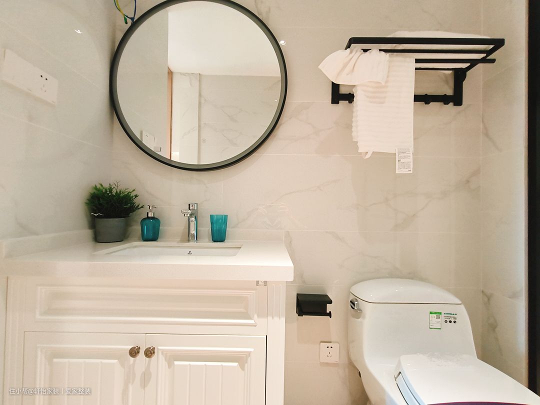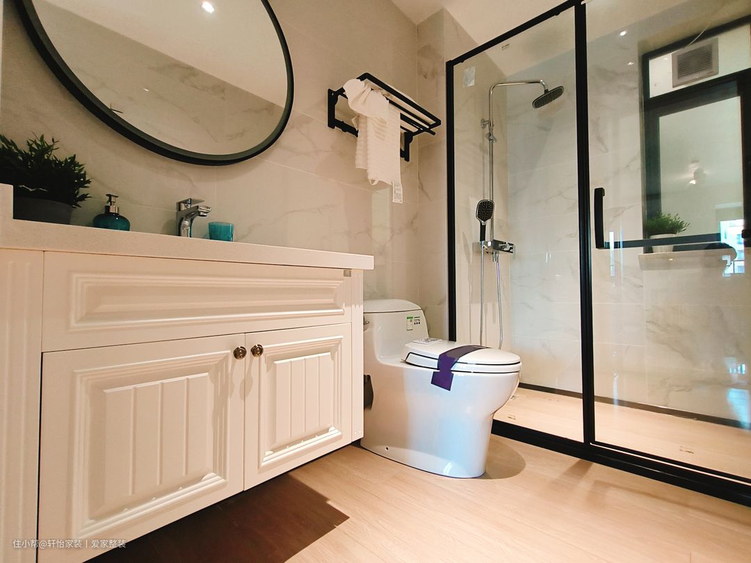主卫抛弃一贯的镜柜设计,采用太空铝镜框,简约更出彩,高清镜面,保持平滑真实成像,不变形,加厚边框,结实耐用。整个空间呈现被细腻奶油包裹的温柔氛围,陶瓷一体台盆创造巧妙的收纳空间,高温烧制一体盆,釉面光滑易清洁,不易藏污耐垢,一抹就干净,加大防溅陶瓷盆,有效减少渗漏发霉。 黑色悬空式置物架轻松收纳,拒绝浴室脏、乱、臭,还你清爽浴室,高密度太空铝拒绝腐蚀生锈,合理间距设计,使用更顺手。黑色框的玻璃门隔开浴室和洗手区,实现干湿分离,保证卫生间的干燥洁净。 时尚精致的洗手台设计,适合小户型,节省空间,实用兼顾美观,镜柜大型储物空间,告别浴室杂乱,主柜大型储物空间告别浴室杂乱,抗菌釉面瓷盆洁净洗漱,贴心包边设计防水防潮更加实用。 客卫同样采用干湿分离的设计,让卫生间更加整洁。