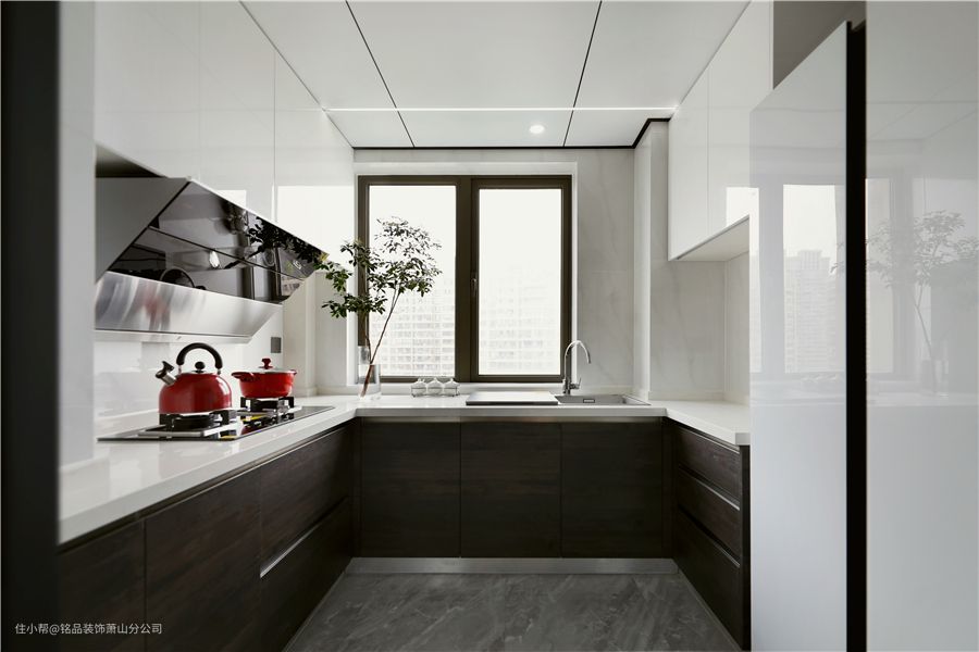 厨房是利用常见的U型动线布局,深色橱柜门配白色岩板操作台面,浅灰色地砖以及纯白色的墙面,分别在视觉上打造出了一定层次效果。 宽大的操作台,让使用者可以洗-切-蒸-煮都很方便,我想在这样的环境下给家人制作美食,心情一定很美好吧~#动线布局 #岩板 #厨房 #集成吊顶 #橱柜