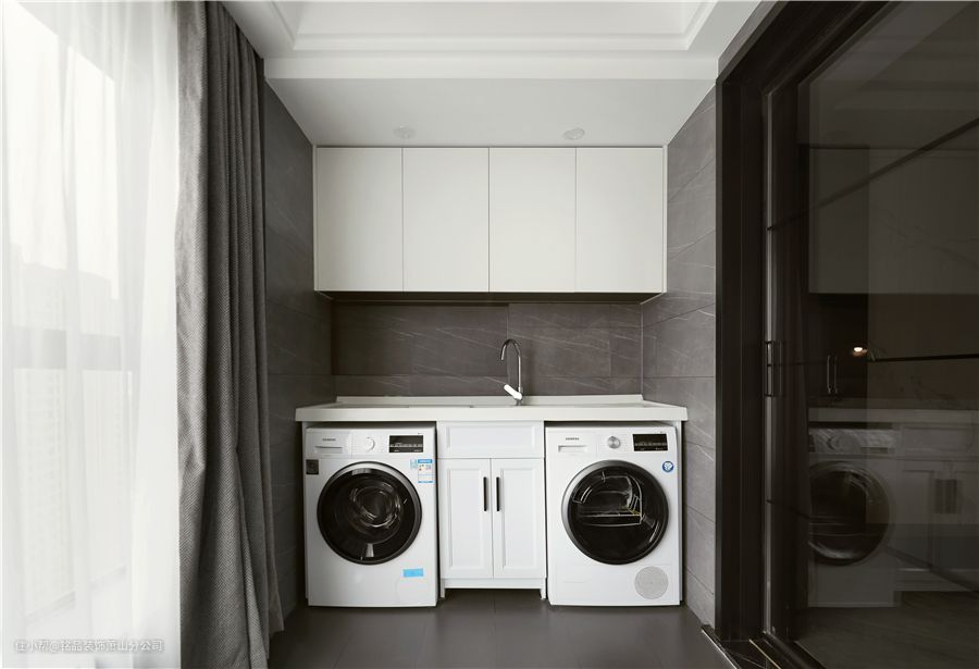 阳台打造成现在流行的生活区设计,洗衣机、烘干机分别嵌入洗漱台两侧,中间是橱柜可以用来存放洗涤用品,如洗衣液等。上方定制的吊柜采用无拉手方式,简单利落。 接近水泥色的地砖和素雅灰墙砖,形成一个过渡匹配,视觉上很舒适。#吊柜 #烘干机 #柜 #洗衣机 #水泥 #阳台柜