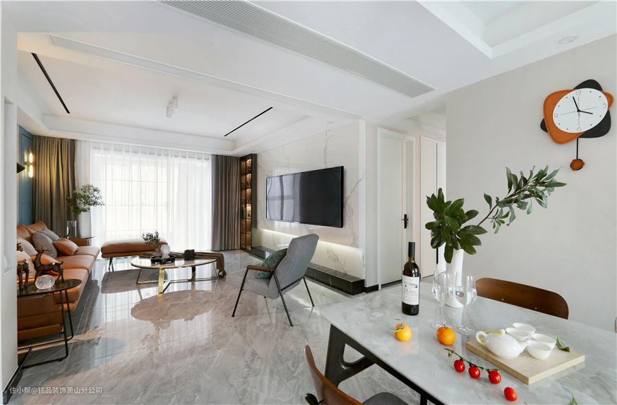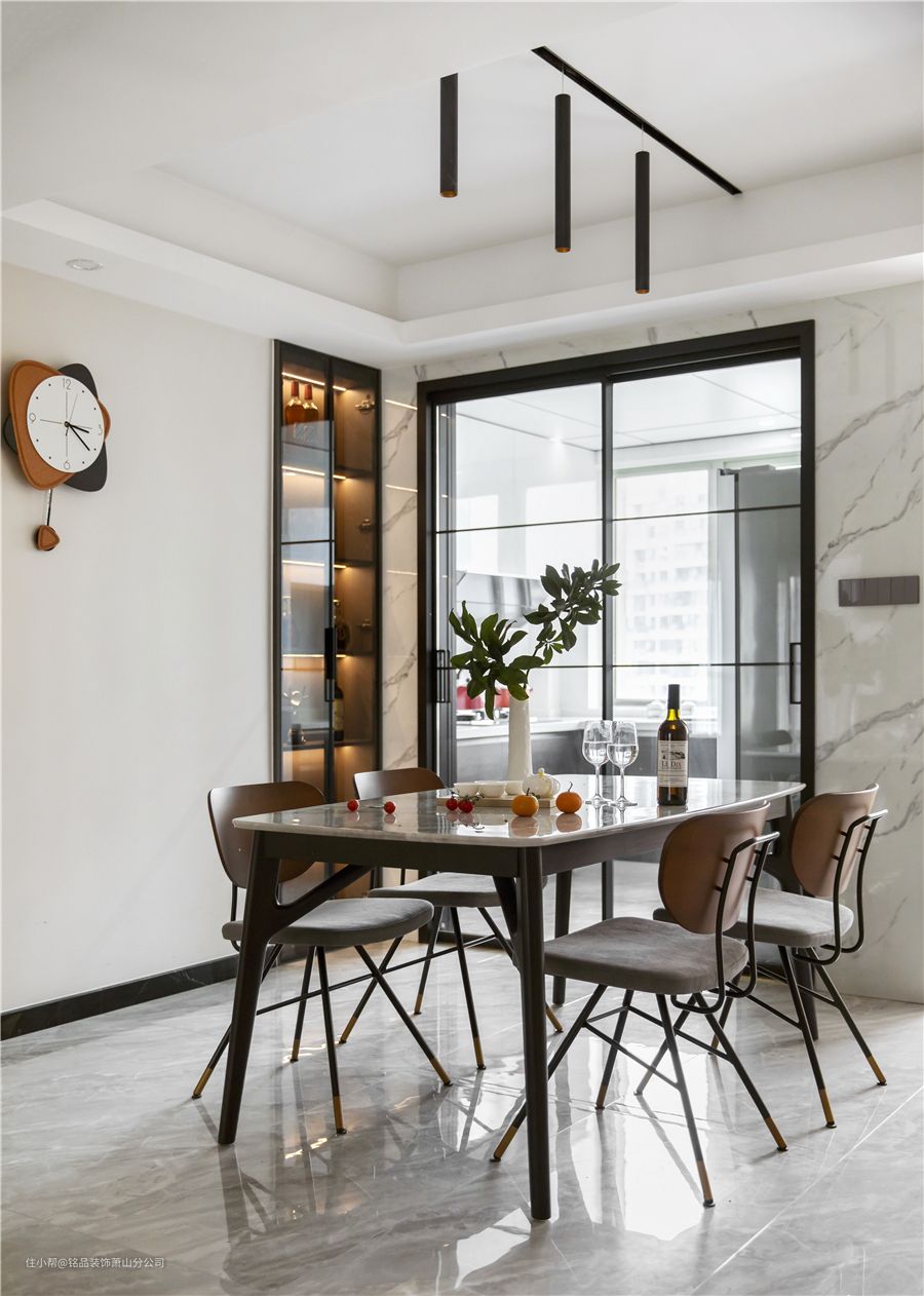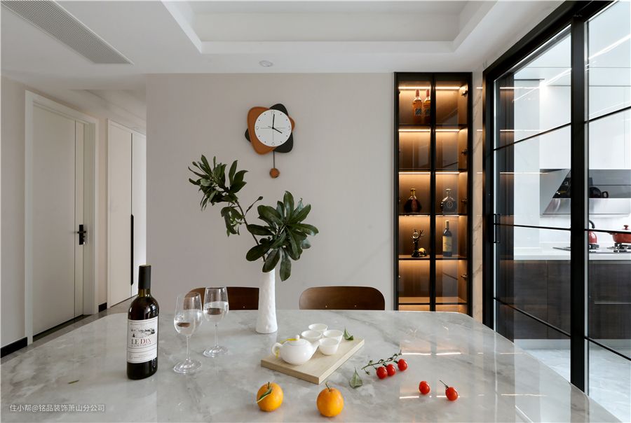 这边背景墙挂了一个小创意时钟,这样就餐的时候就不用带手机,看个时间也很方便,为家人之间营造了更加细腻有爱的就餐氛围。 靠近厨房的墙体定制了面餐边柜,与客厅的橱柜风格一致,让两个区域之间彼此成就,相互呼应!每一层都添加了灯带,营造了满满的高级温暖感。#餐厅 #餐边柜 #客厅