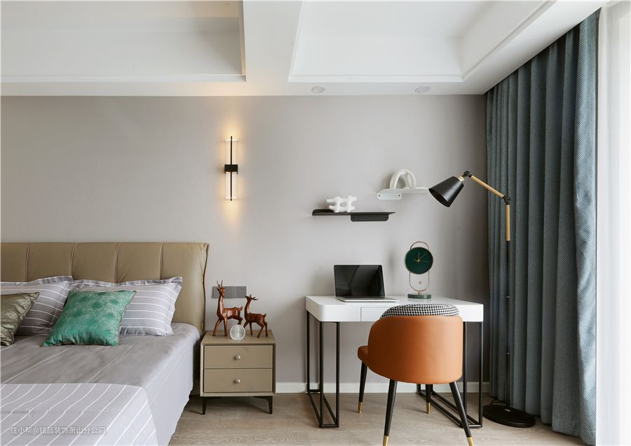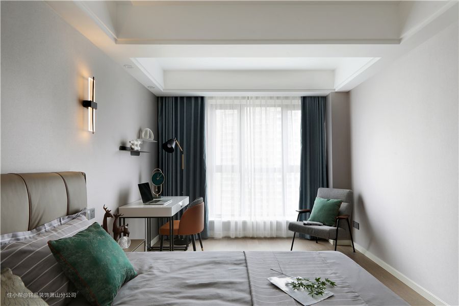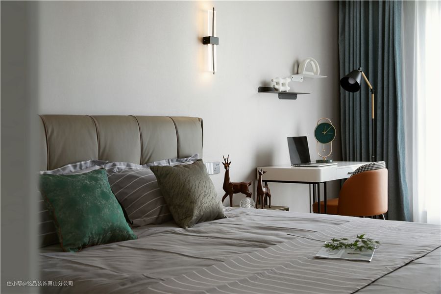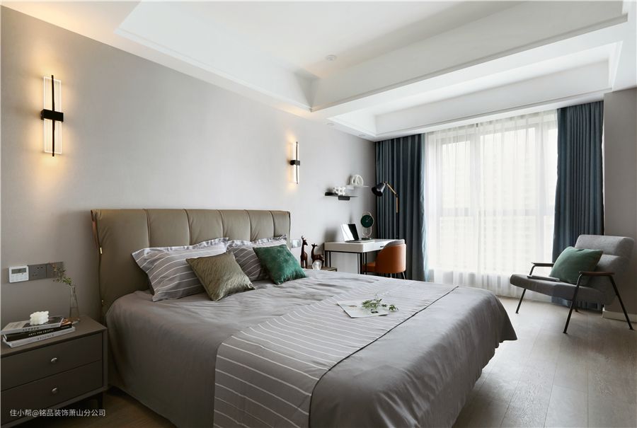 主卧依旧是将简约和配色之间分寸把握刚好,背景墙采用硬木护墙板装饰,细线框装饰与公区风格遥相呼应,也增强了室内的空间感。 床头两侧对称的床头壁灯,暖黄色灯光亮起休憩空间更显得温馨美好呢。千鸟格床尾凳大气感十足,放一些日常穿搭的衣物方便,也可以充当装饰摆件呢,提升室内格局。#木饰面 #壁灯 #床尾凳 #不锈钢 #主卧 #无主灯 #落地窗