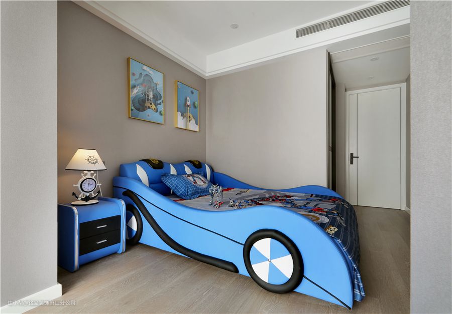 儿童房不得不说是本案设计的一大亮点,小男孩房间墙体是灰白色为主,同样无主灯设计更显得干净利落。蓝色床铺体现了男孩子的性格,也是视觉上一道点睛配色。 床头背景墙挂了两幅金属镶框的蓝色画,与床品相互同步。 创意感蓝色床头柜,边角弧形处理保护了宝宝的安全,避免磕磕碰碰。而且细节处理更能体现出设计师在生活上的细心周到。海盗船风格的床头灯兼具小闹钟,每天替父母温柔唤醒宝宝,开启新活力的一天。#床头背景墙 #床头柜 #蓝色 #卡通 #儿童房 #男孩房