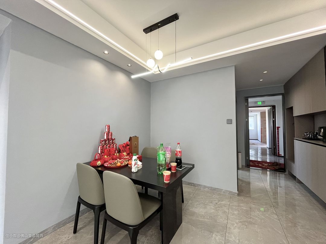 主灯:4000K的金属主灯搭配。 餐桌:烟熏灰的原木餐桌。 凳子:灰调的细脚皮质凳子。