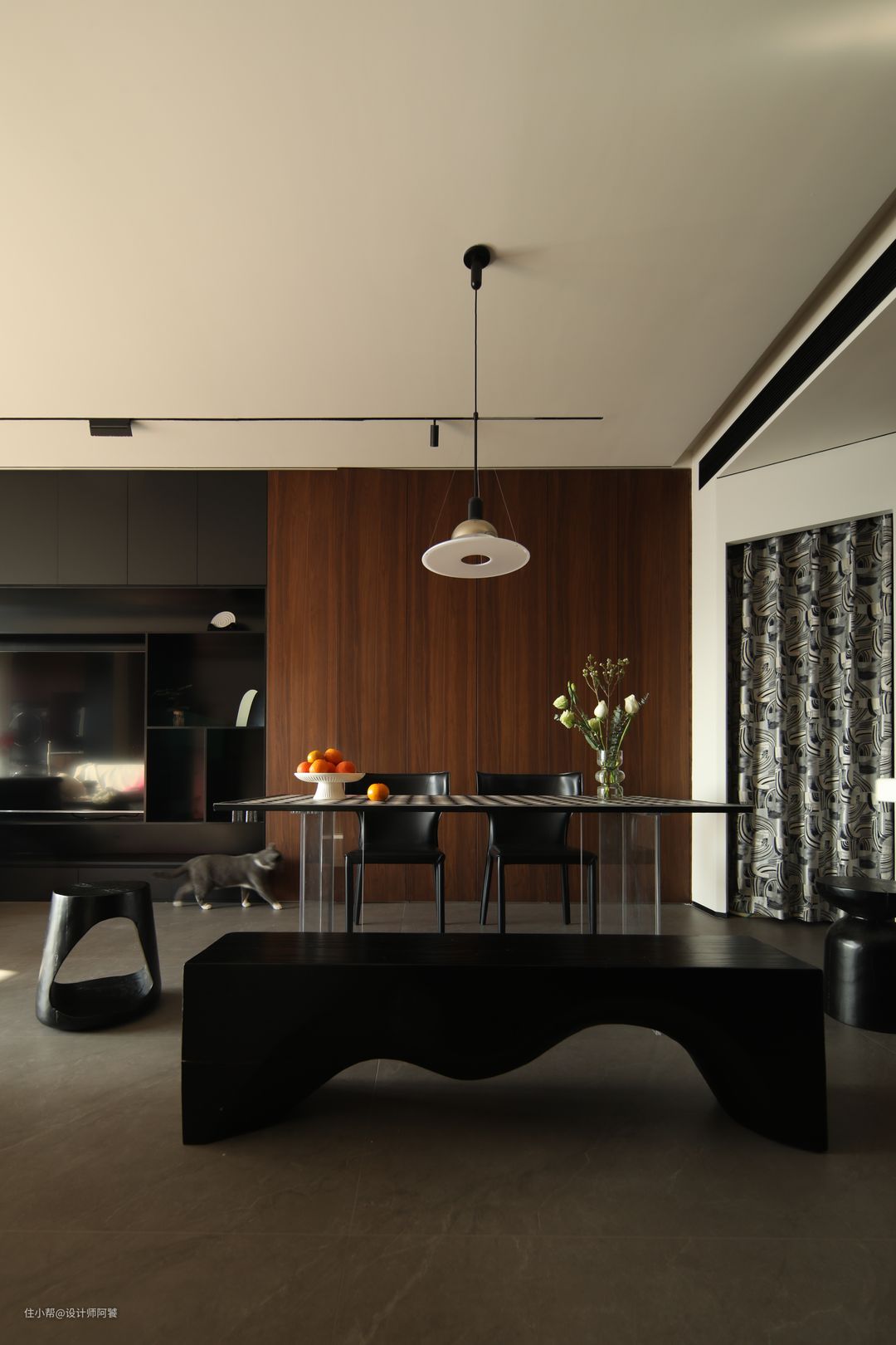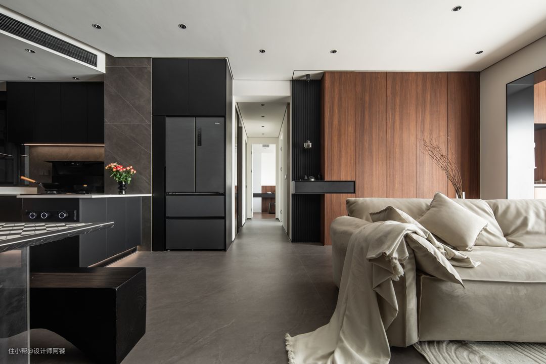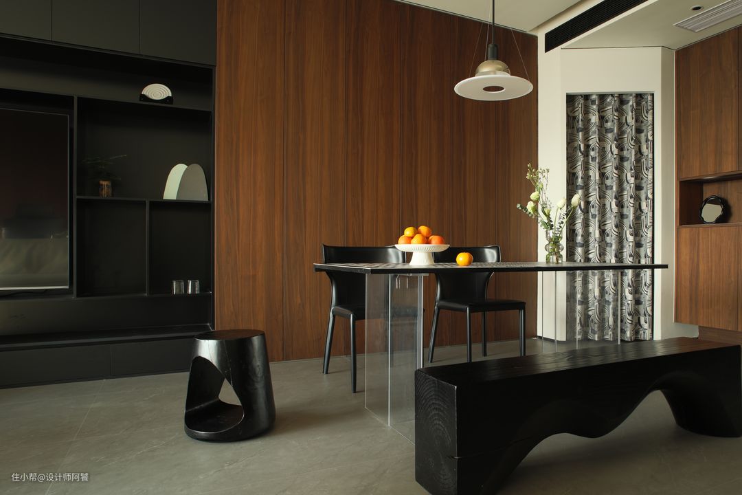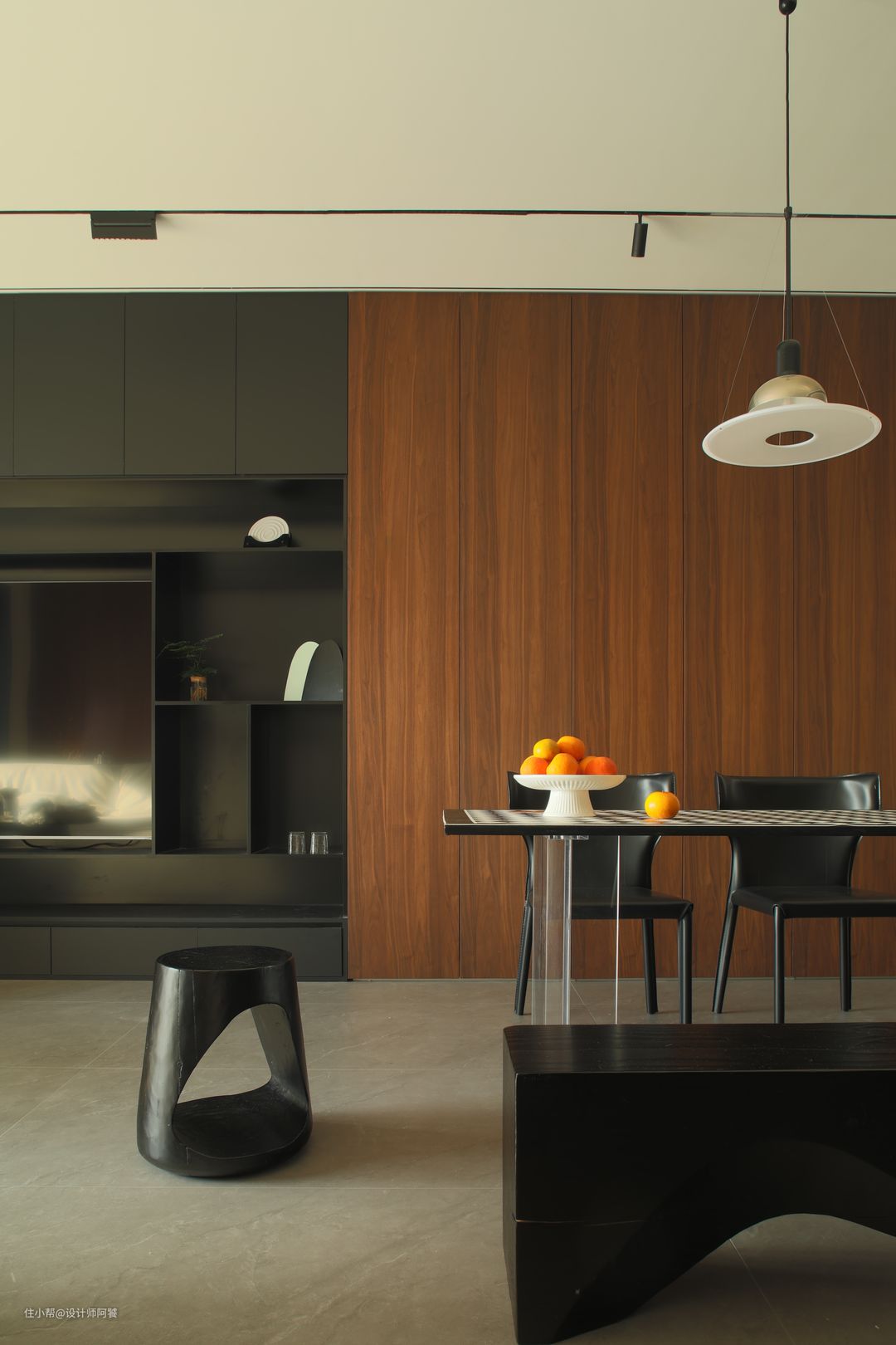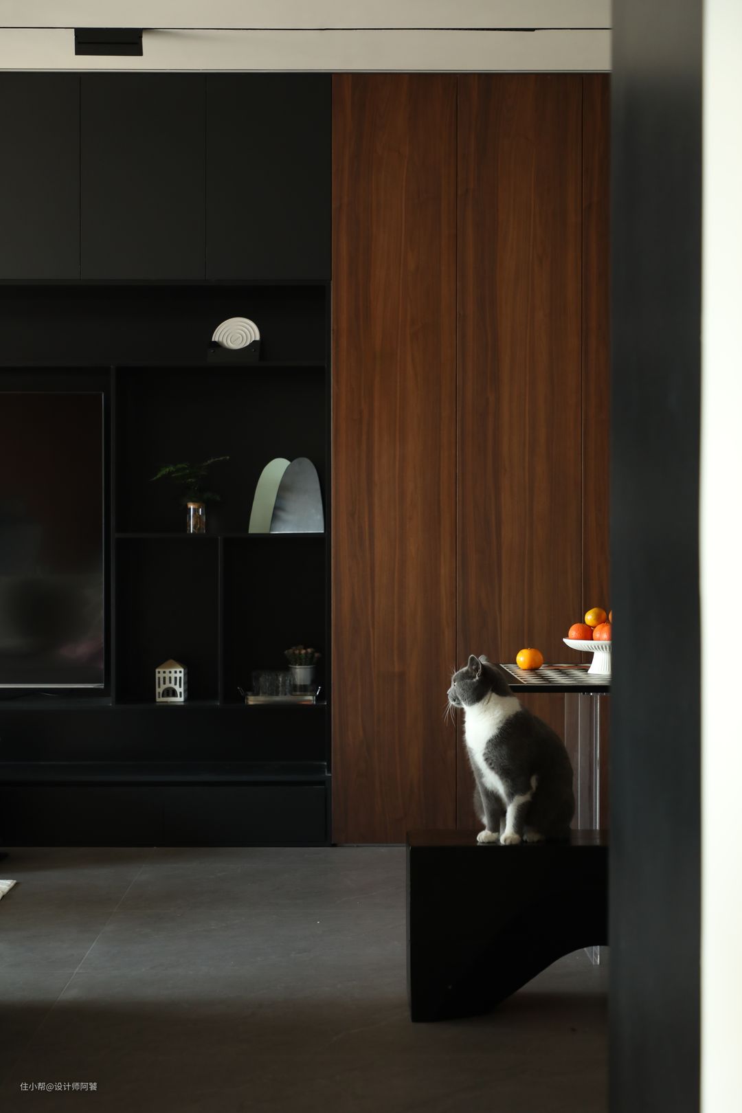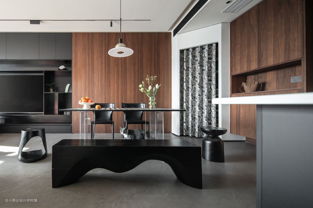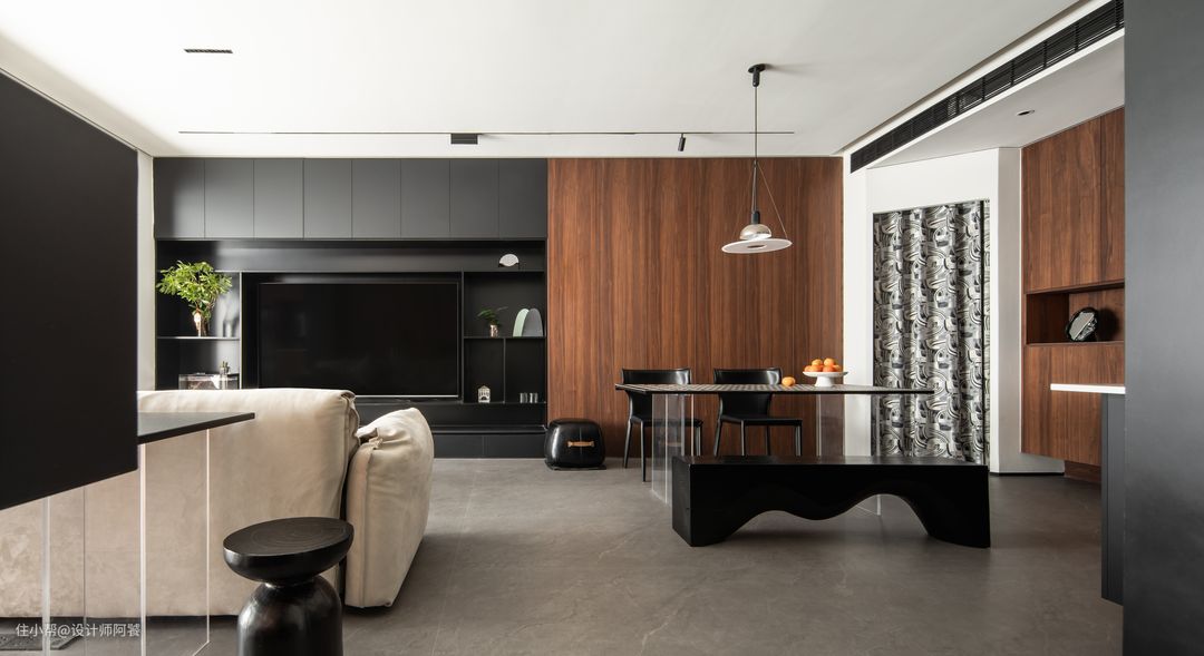 极简 x 暗黑风客厅,永不褪色的家 黑色背景墙搭配胡桃木色储物柜 沉稳又带着一丝神秘色彩。 无主灯的设计结合黑色背景墙,既冷酷又不失温馨的感觉。利用暖色的灯光中和,为整个空间注入了温暖和舒适的氛围。 餐厨相邻,餐边柜和客厅背景统一色调,黑色木饰面简约到位。连贯的设计不仅使视觉上更加显大气,也增强了整体的一致性和和谐性。 将高级感进行到底。