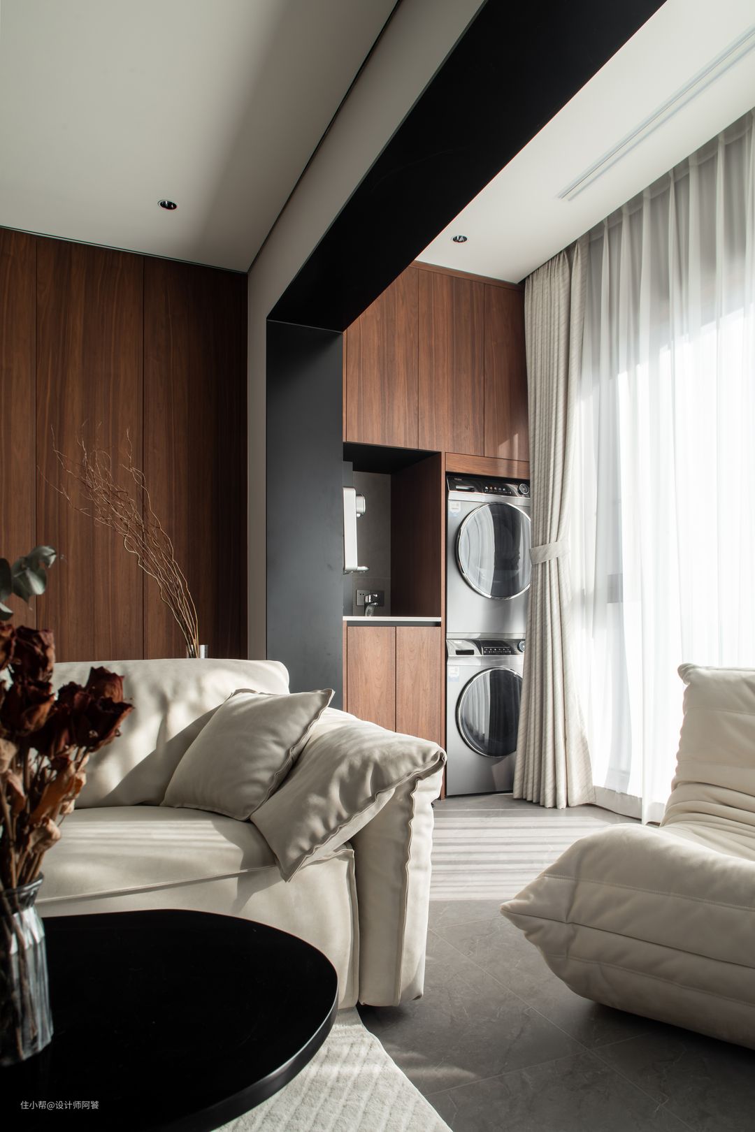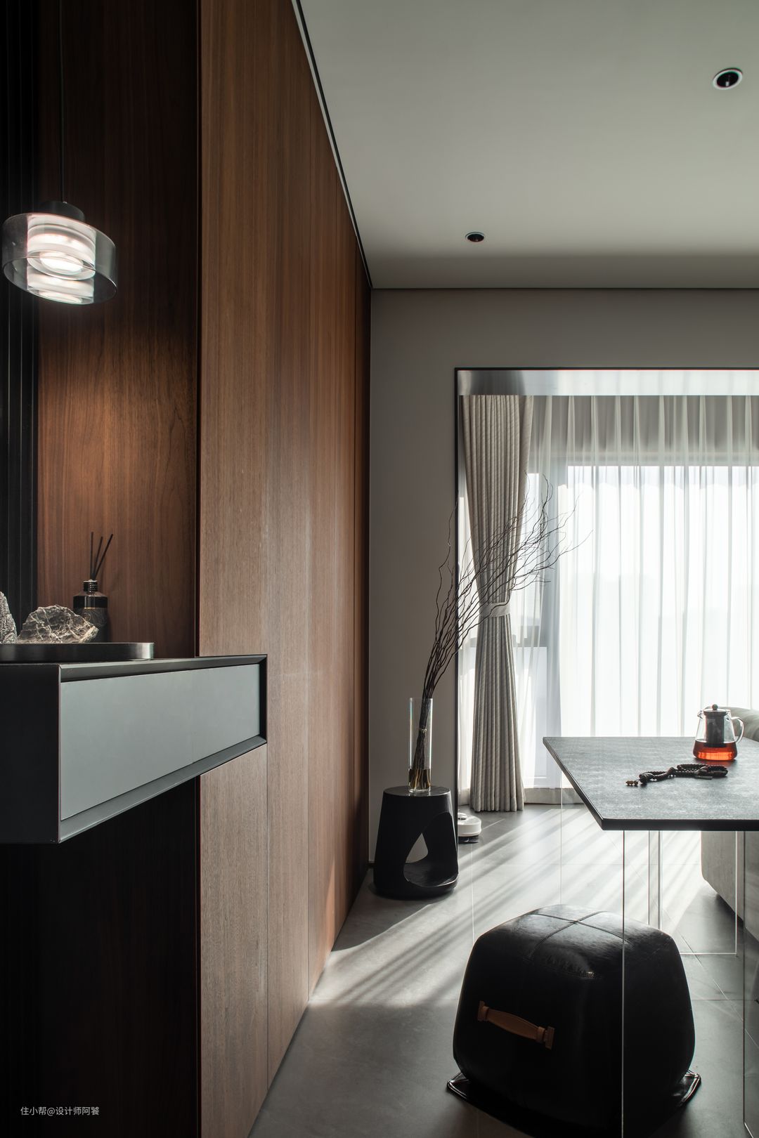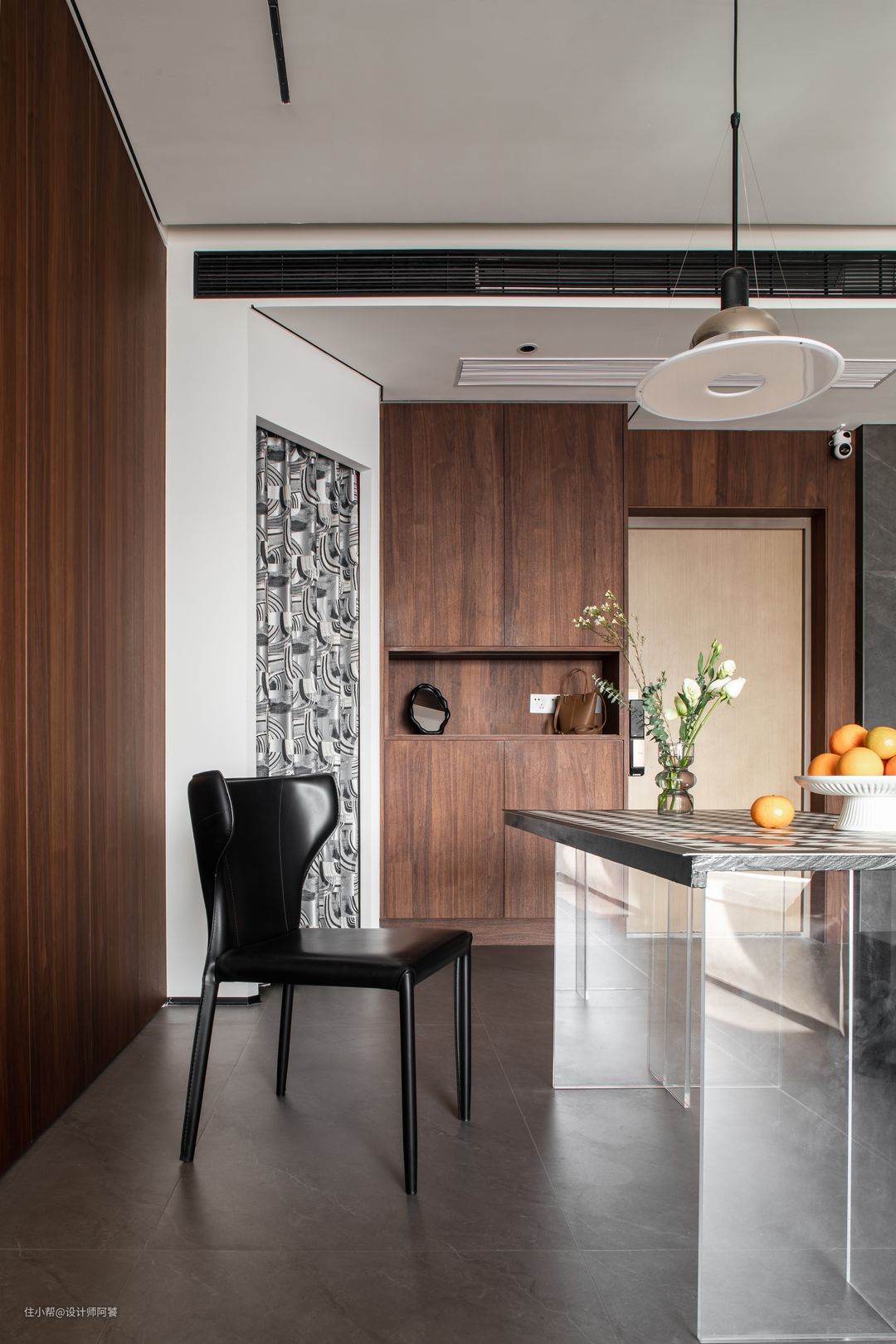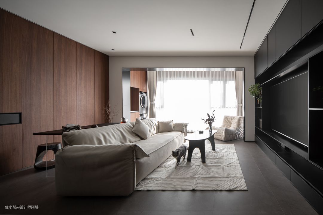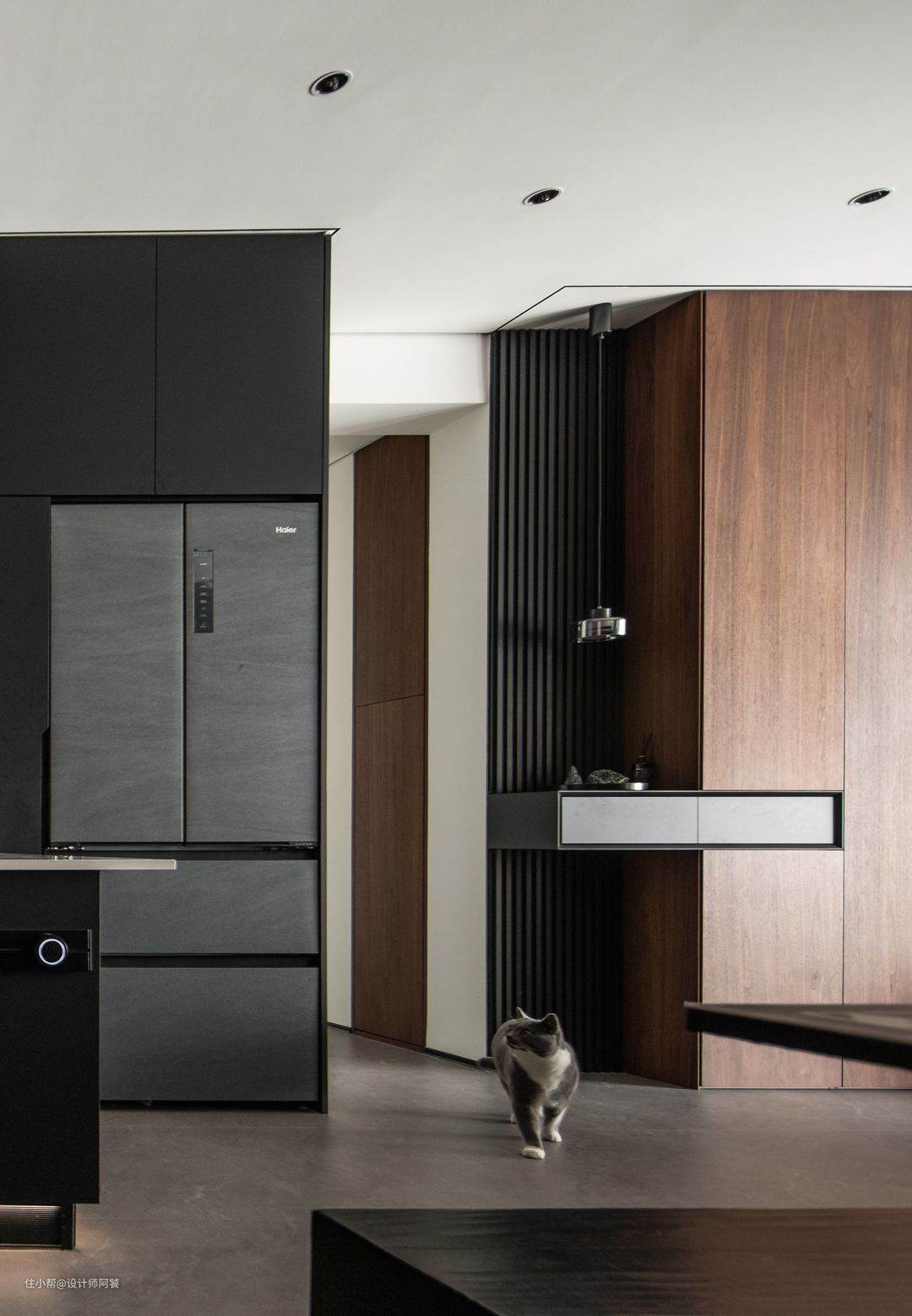 极简 x 暗黑风客厅,永不褪色的家 黑色背景墙搭配胡桃木色储物柜 沉稳又带着一丝神秘色彩。 无主灯的设计结合黑色背景墙,既冷酷又不失温馨的感觉。利用暖色的灯光中和,为整个空间注入了温暖和舒适的氛围。 餐厨相邻,餐边柜和客厅背景统一色调,黑色木饰面简约到位。连贯的设计不仅使视觉上更加显大气,也增强了整体的一致性和和谐性。 将高级感进行到底。