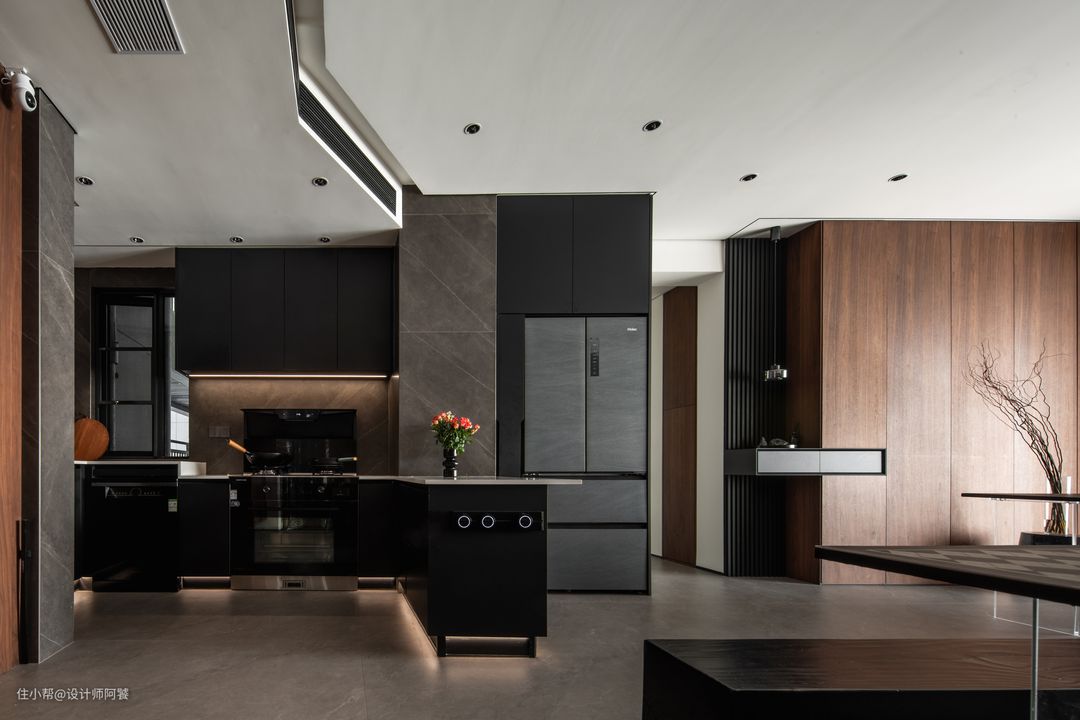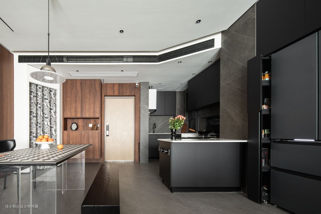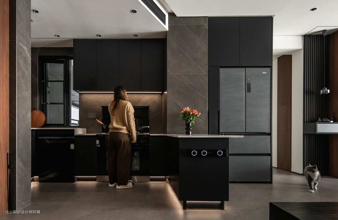 开放式空间融合极简主义理念,与黑色不期而遇🖤 将厨房和餐厅打通,空间显得格外开阔,动线也变得流畅起来,特别符合年轻人的生活方式。 无处不在的氛围灯光设计,营造惬意高级的美感,低调的个性感也随着氛围灯带蔓延开来。 充足的橱柜到顶设计,收纳空间up,地柜分层抽屉,使视觉增强延伸感,美观实用。