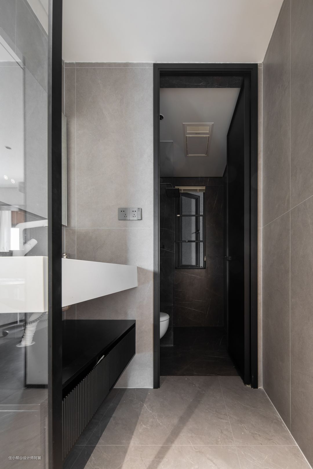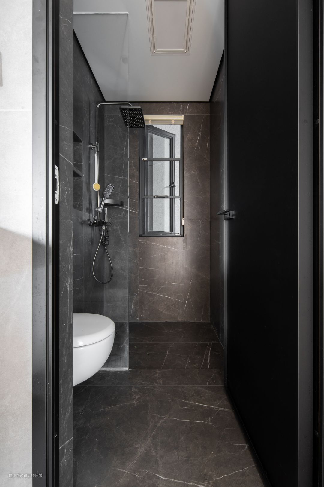 极简黑色卫生间,⚫️纯黑肌理瓷砖 卫生间简约的设计+纯黑肌理瓷砖 深沉低调又充满高级。 搭配暖色灯光,光反射出来的那种肌理感,淳朴自然。 贴砖尺寸为600*1200规格墙地通铺,缝隙更少更极简!