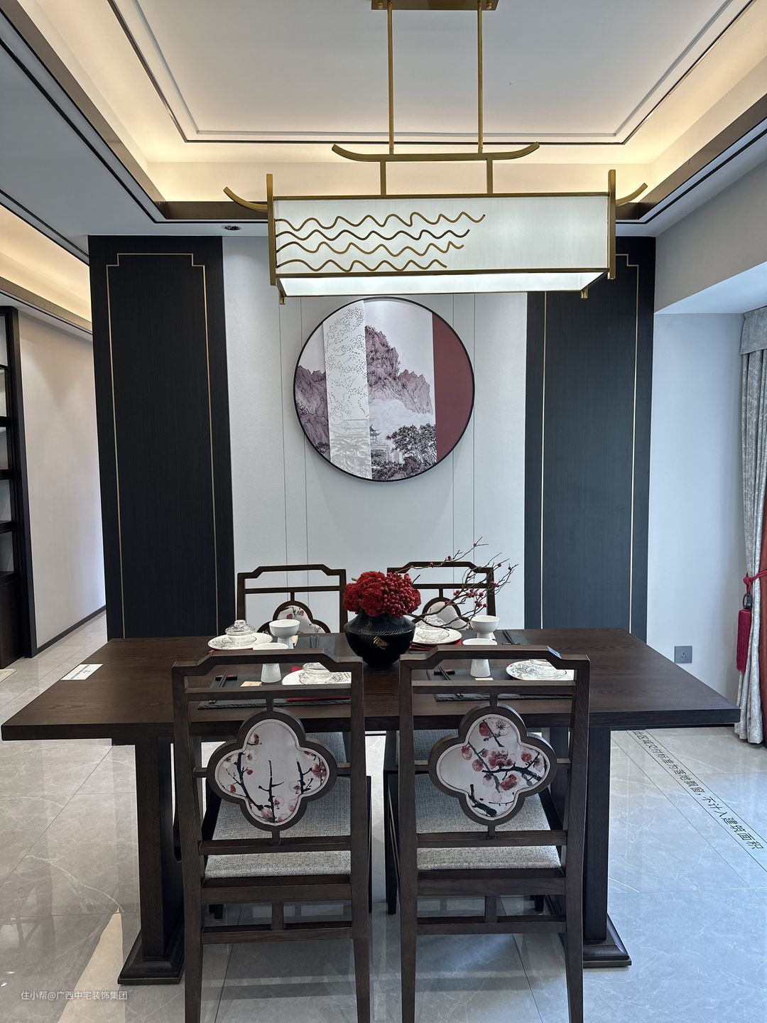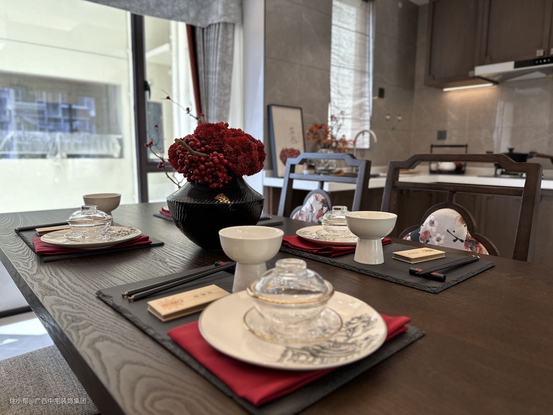 餐厅设计独具匠心,以新中式为主题,简洁硬朗的线条彰显中式的霸气与力量。古色古香的餐椅搭配多彩元素,特别是中国红的点缀,为餐厅注入喜庆与活力。长方形餐桌作为空间核心,营造和谐用餐氛围,家人围坐共享美食,感受中式文化的韵味与温度。