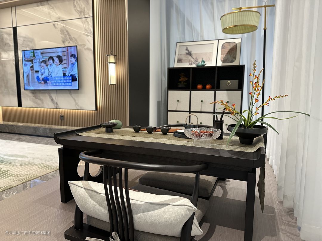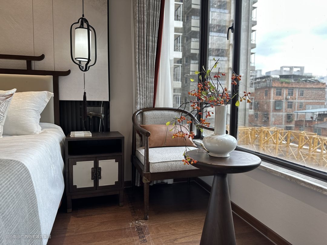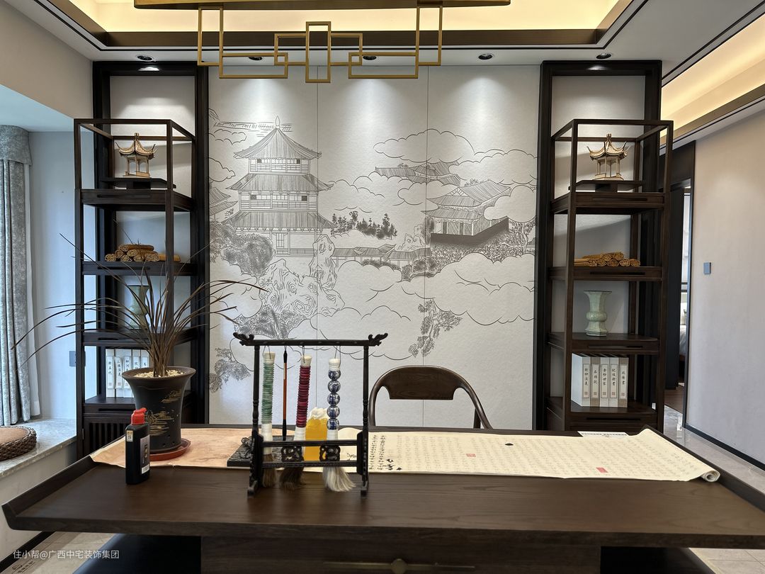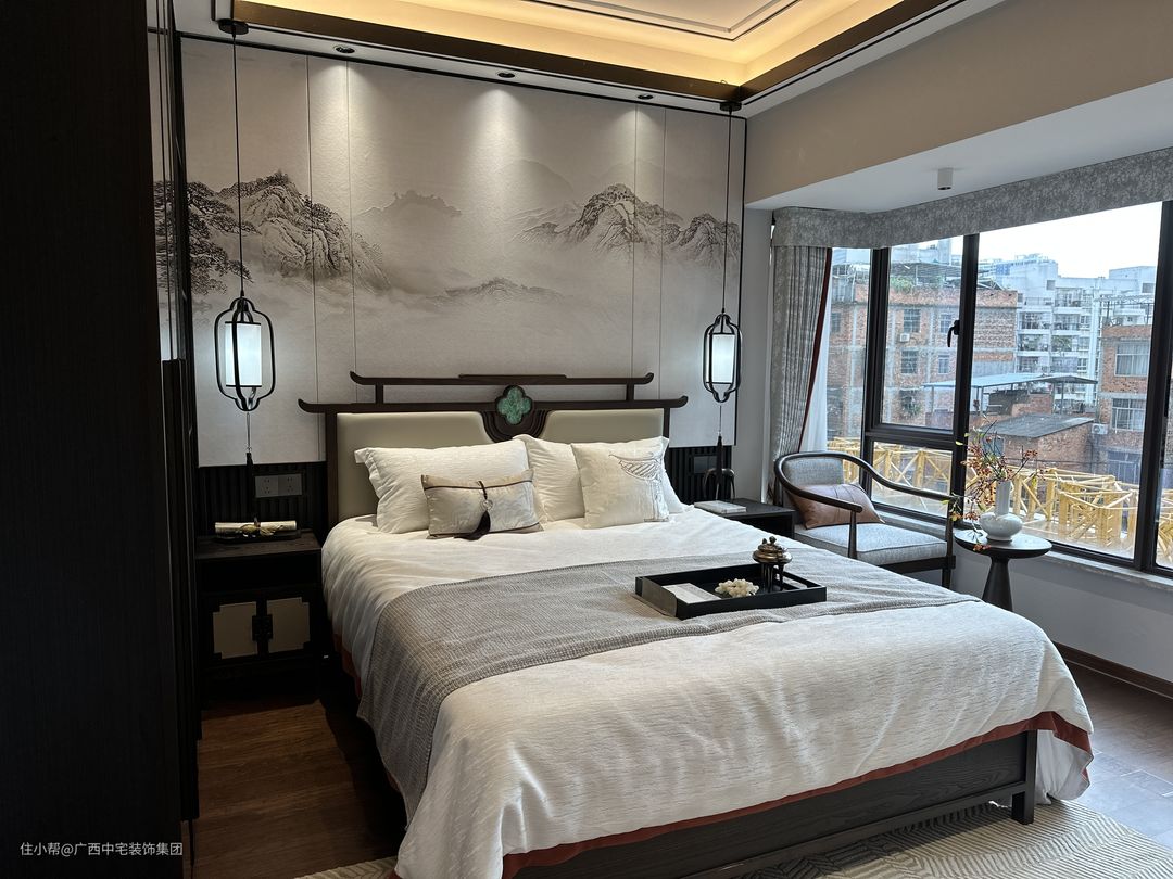 次卧设计以中式山水为主题,背景墙宛如层峦叠嶂的山脉。运用线条与灯光勾勒层次,将现代与传统元素和谐融合,营造自然、温馨、舒适的氛围。中式床铺柔软舒适,木质地板与整体设计相得益彰,共同构筑和谐统一的空间。在此,生活的繁忙与疲惫得以消解,只余宁静与安逸相伴。