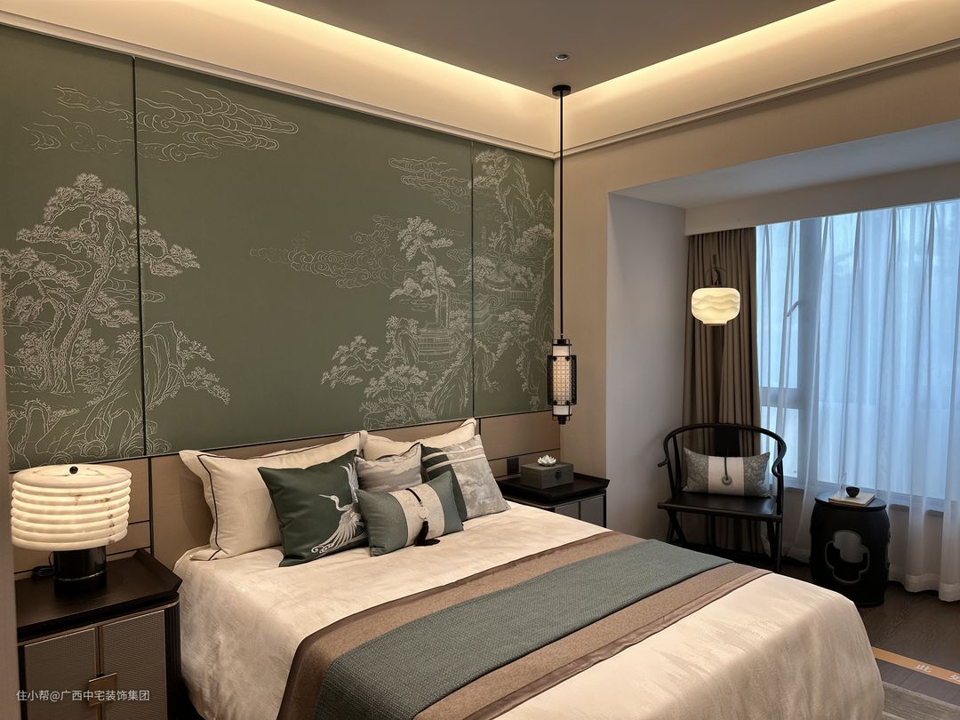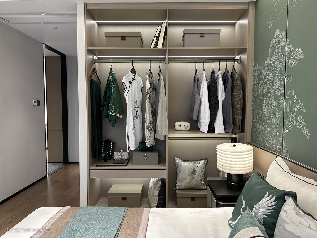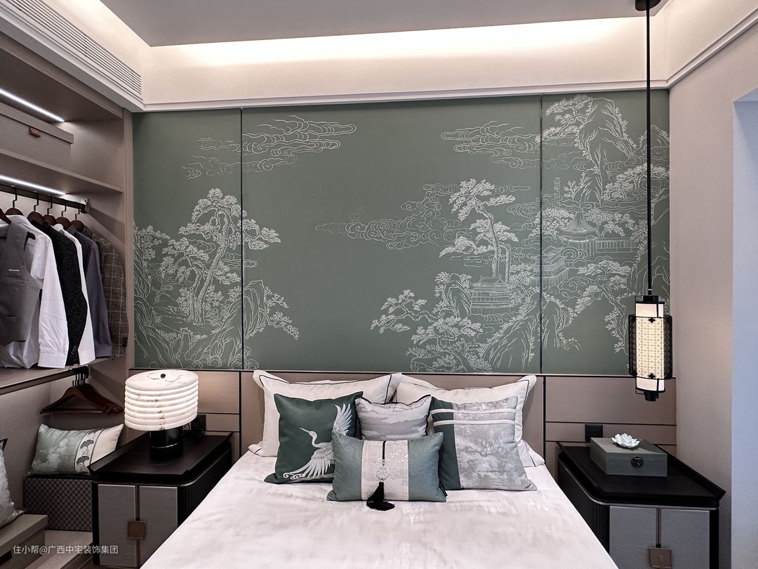 主卧绿意盎然,如置身自然怀抱。背景墙以传统松树、白云、古建筑为元素,宛如一幅幽静的中国画,散发传统美学之韵。衣帽间巧妙点缀中式旗袍与西装,传统与现代交相辉映,形成视觉盛宴。