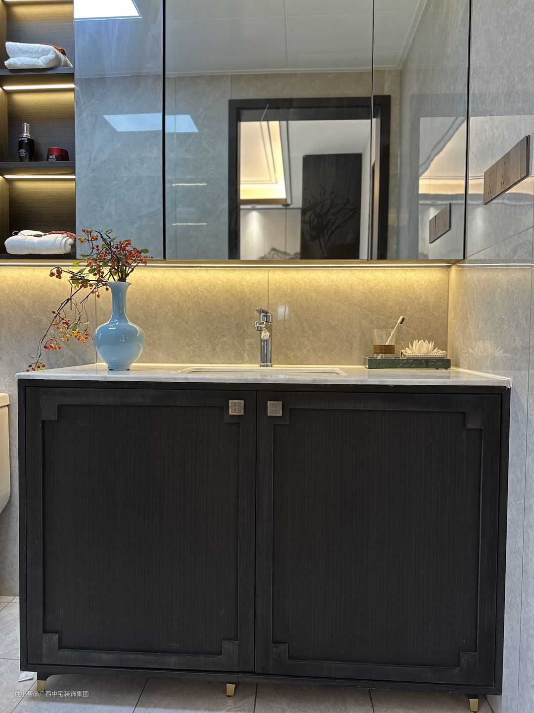 卫生间镜柜一体化设计简约而不简单。它既是整理妆容的佳伴,又是收纳日常用品的得力助手,小设计彰显大智慧。柜子内部空间宽敞,毛巾、洗漱用品等收纳得井井有条,空间利用最大化。洗漱台上下分区设计,上方清爽洗漱,下方储物井然,小空间发挥出大用途。
