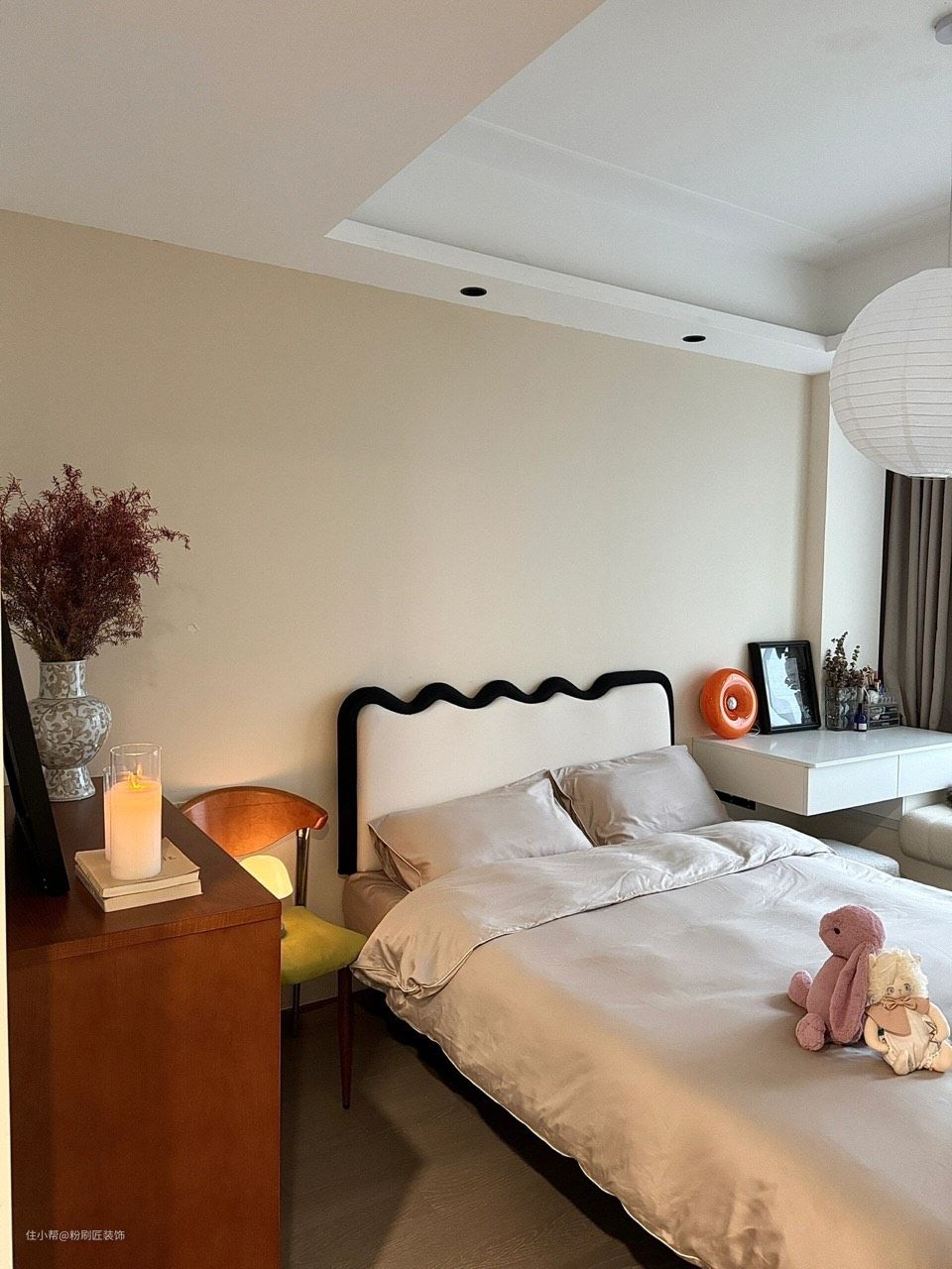 主卧1800*2200的法式双人床 飘窗延伸做化妆桌 充分利用空间 床头上方 做吊顶嵌入筒灯 打开 氛围感满满 一侧的桃木色斗柜 高级使用