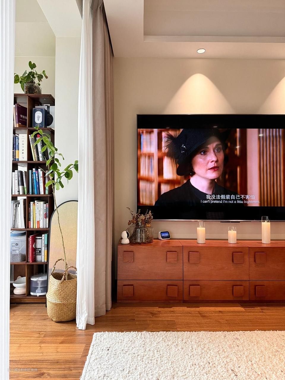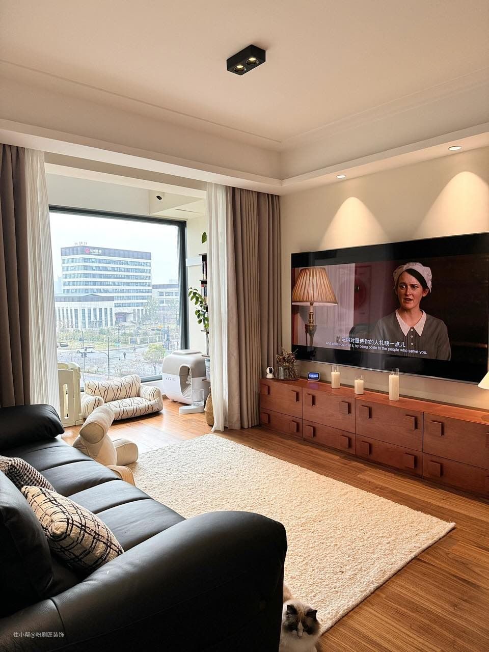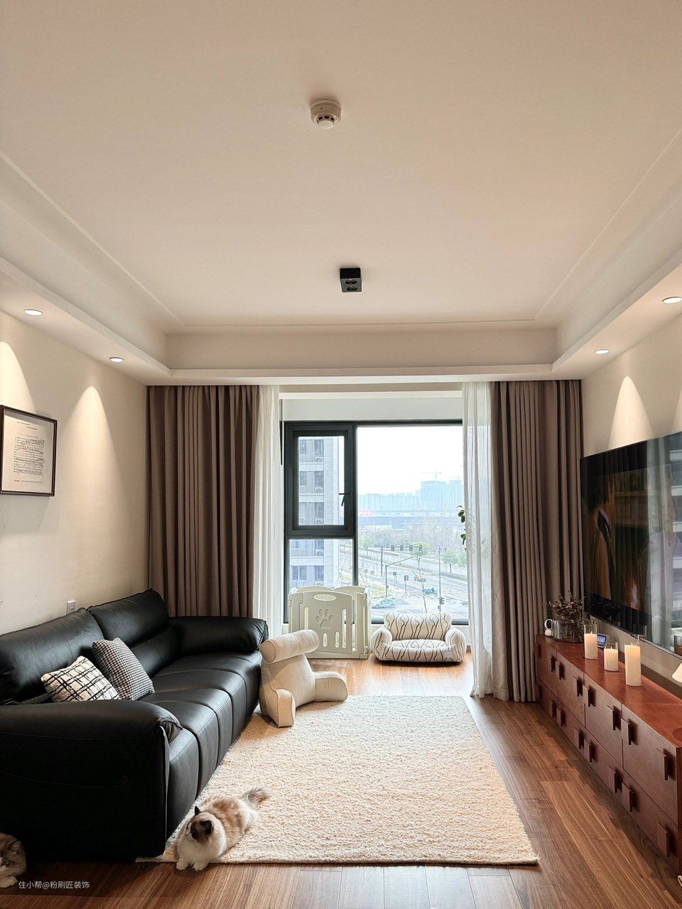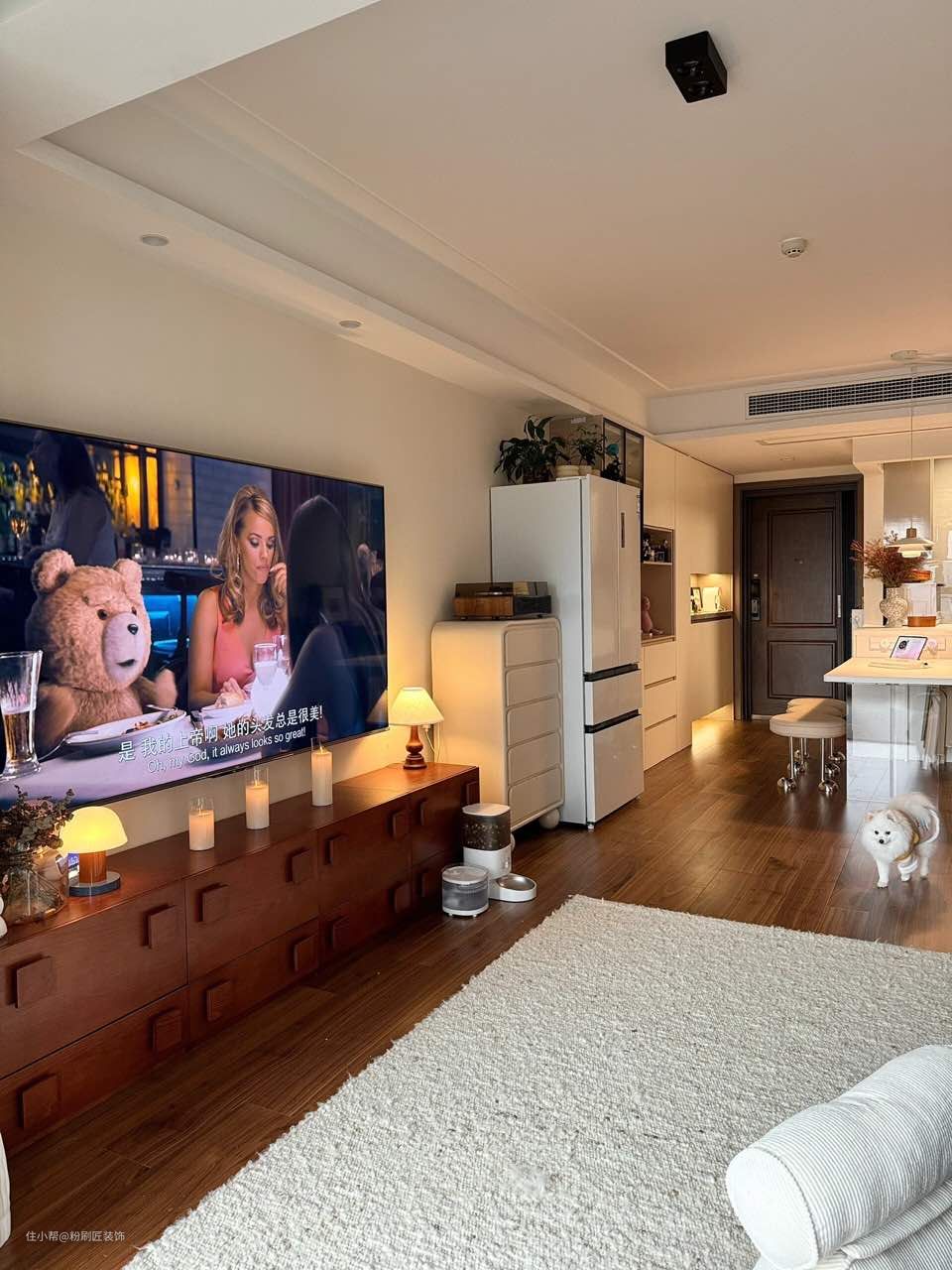 桃木色木地板通铺客餐厅 边吊设计嵌入筒灯 增强氛围感 菱花白乳胶漆 通刷墙面 灯光打在墙面 增强氛围感 无主灯设计 选用明装筒灯 简约大气