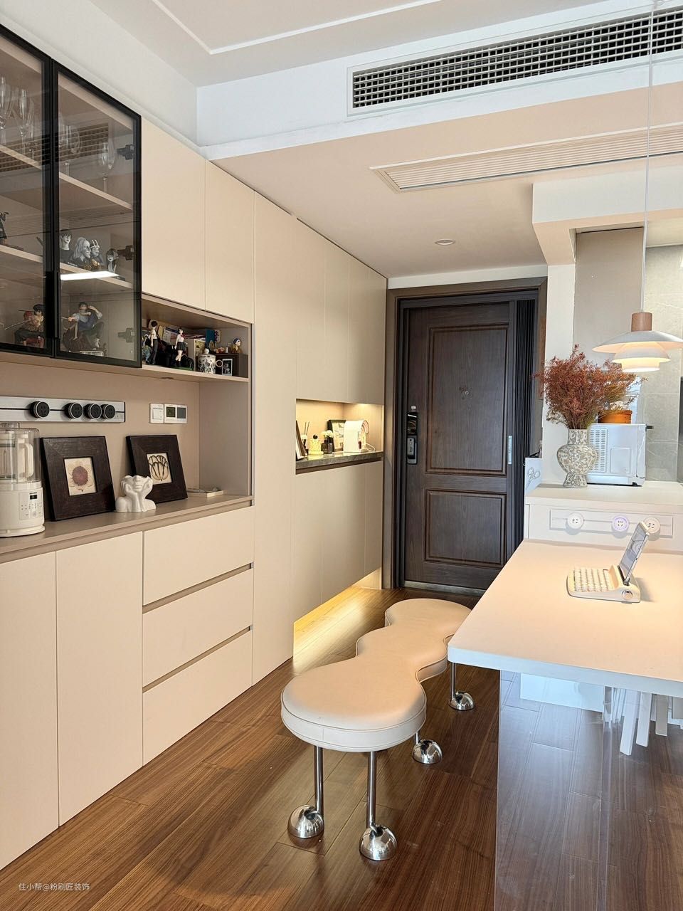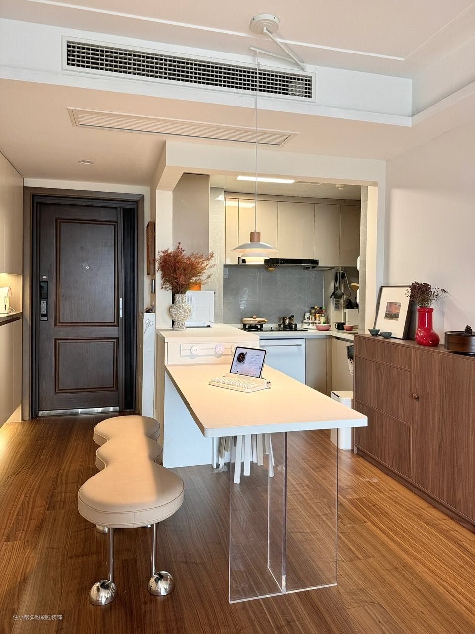 开放式厨房 吧台延伸做餐桌 亚克力做支撑 简约时尚 餐边柜与鞋柜一体设计 效果更佳 靠近厨房一边放置斗柜 上方可以摆放一些装饰品 增加情调