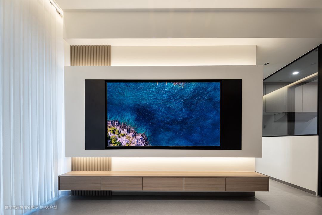 米色的皮质沙发与黑色的茶几相互映衬,犹如黑白琴键上跳跃的音符,奏响着生活的旋律。悬空电视背景凹凸墙与悬空木质电视地柜的搭配,宛如一场精彩的空间对话,彰显着设计的巧思与品味。木饰面沙发背景墙搭配格栅装饰,为客厅注入了一抹自然的气息,让人仿佛置身于大自然之中。...