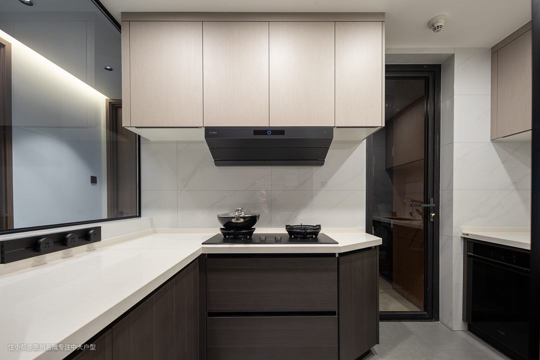 厨房的主色调恰似一幅绚丽多彩的画卷,米色、白色、棕黑、灰色相互交织,宛如一场视觉的盛宴。黑色的透明玻璃宛如一扇晶莹剔透的窗户,透过它,厨房的美景一览无余,犹如一幅引人入胜的画卷展现在眼前。