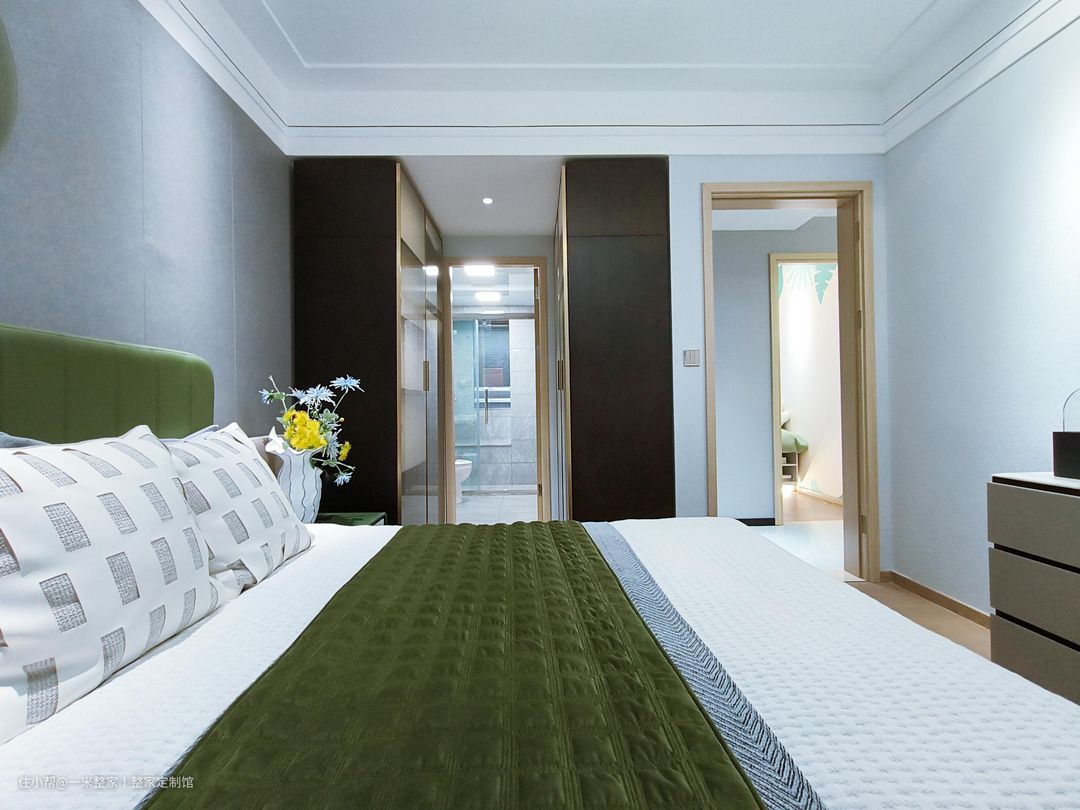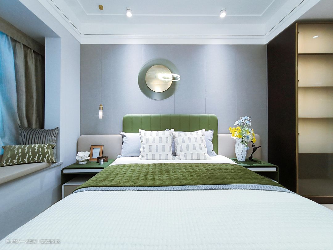 次卧的床品选择了清新的草绿色,不仅耐看,而且和窗帘的颜色很搭。飘窗上面铺上垫子,放上抱枕偶尔坐着看书发呆也是极佳的放松去处。床尾的装饰画和床头的相呼应。 在床的右边是定制一面封闭+开放格组合的通顶衣柜,多功能储物,通过科学合理的布局,让物品摆放更有条理,为生活带来了惬意从容的氛围感。 床尾是摆放梳妆台区域,岩板实木梳妆台+收纳柜一体组合,不仅颜值高,收纳能力也是超强的,而且边柜还可以根据实际情况灵活调节,同时镜子是采用智能三色LED灯设计,让你夜间护肤也不怕。