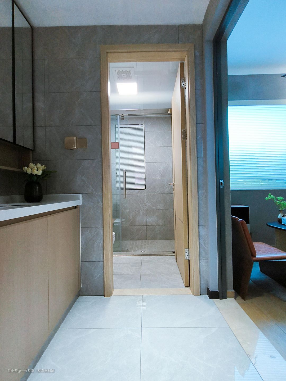 主卫通铺灰色花纹长砖,让空间充满整体感,浴室柜和镜柜选用浅棕色,贯彻整屋一贯的颜色搭配,镜柜的一侧是开放格设计,放常用的瓶瓶罐罐十分方便! 浴室区域采用了玻璃门隔断,既方便日常使用,又增强了整个空间的透明感。 而洗漱台的上方是做一面镜柜的设计,在镜柜下方加上灯带,不仅增加了收纳空间,也让空间更有氛围感。卫生间主要是灰色为主基调,浅灰色搭配深灰色的设计,不仅打造出高级感,还让清洁简便轻松。同时卫生间里面没有做干湿分离的设计,让整个卫生间宽敞明亮很多。