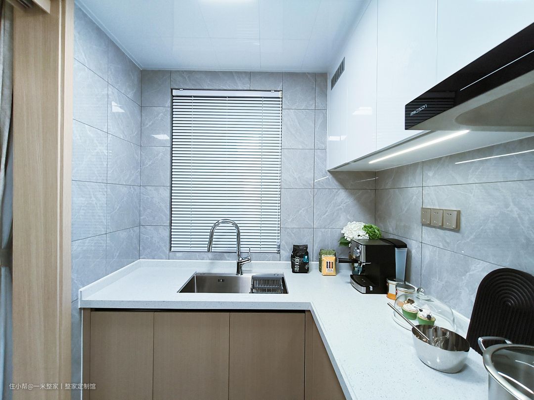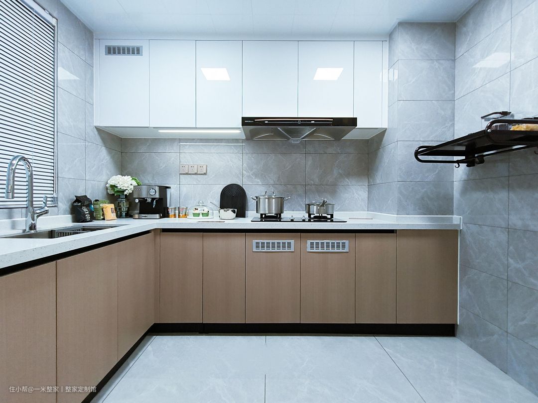 生活是晨起晨落,日子是柴米油盐。L型的布局,使用频率更高,按照洗菜-切菜-炒菜-装盘的动线来布置,动线方便清晰。吊柜+地柜的设计,让厨房的杂物“有地方可待”让女主人对这个厨房满心欢喜。炒菜区下方的地柜门细心的设计了矿泉水瓶盖大小的孔,让内外空气流通,以防万一燃气泄漏,不会在橱柜内部累积达到爆炸极限,也容易被人闻到尽快排除危险!台下盆的设计相对更好清理,不会存在一些缝隙积水发霉等情况发生。简直就是厨房设计的好方法!关于厨房收纳方面,可以多选择墙上免打孔收纳,方便又美观。 厨房布局采用U字型设计,使切洗炒操作流畅自如。在右侧嵌入了现代化的智能电器,包括冰箱、微波炉等,方便烹饪和储存需求。橱柜和吊柜为户主提供了更多的存储空间,让整个厨房更显整洁。