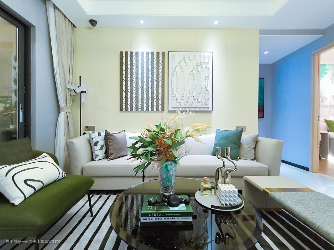 沙发背景墙选择高级感满满的浅杏色,再挂上装饰画,搭配与沙发背景墙同色系的浅色布艺沙发,沙发分别两侧都摆放了不同色彩的单人座椅,点亮了空间的温暖度,这样一来,不仅让空间更有层次感,也直接突出主人不凡的品味。