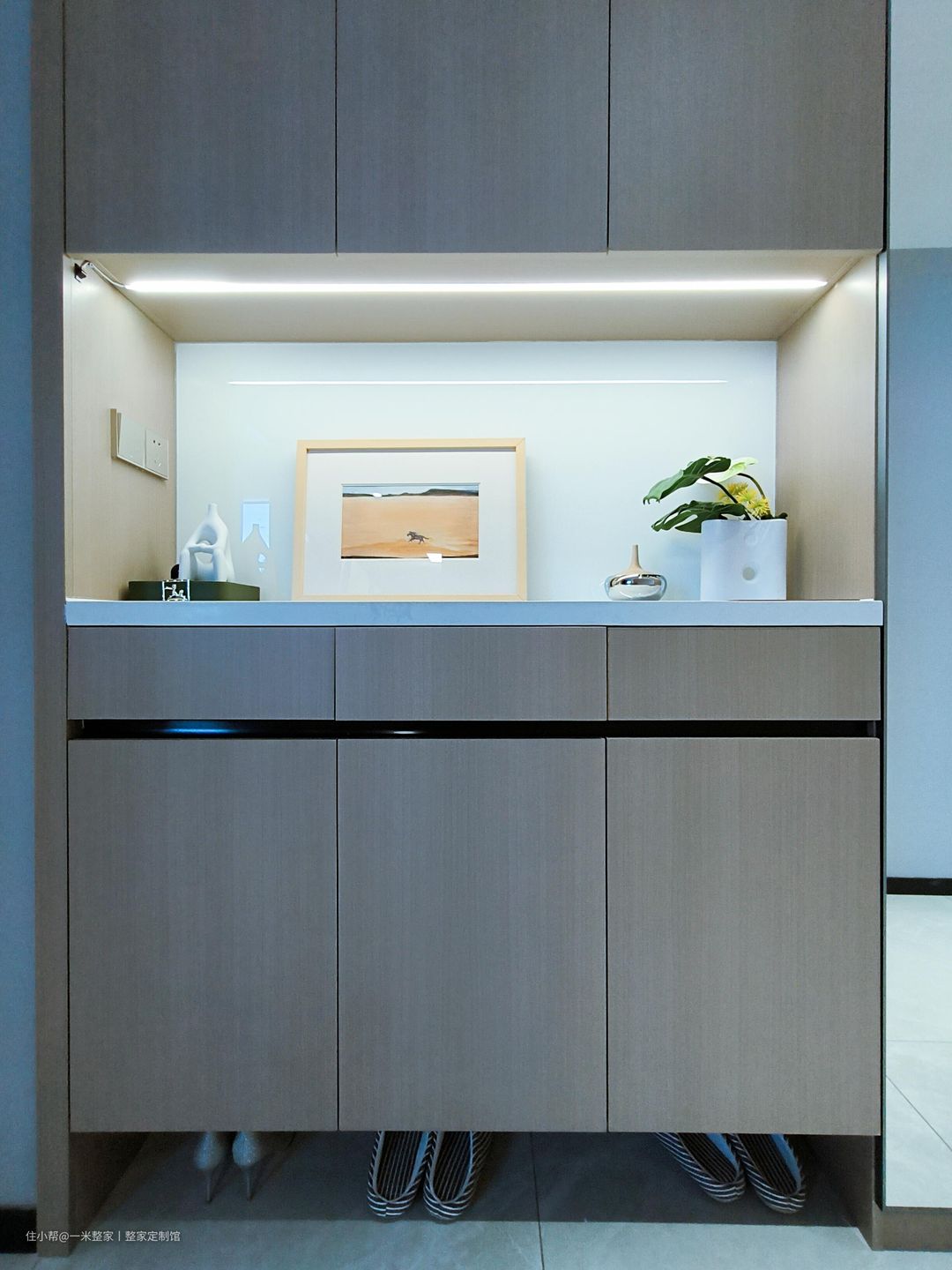 入户便是客厅,宽阔的空间一览无余,充满通透感。靠墙设计到顶,玄关柜中间镂空处可以放随手小物件回家的瞬间,便充满松弛感。胡桃深色的收纳柜门设计,搭配的大理石地砖,玄关贵气,透出大气高端之感。开放格和封闭式设计,满足玄关空间的收纳需求,既实用又美观!