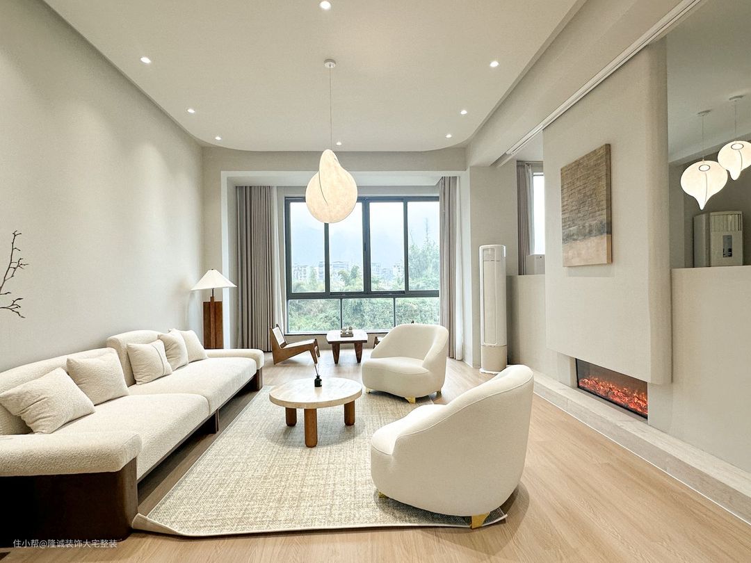 下方的火炉装饰设计更是别出心裁。火炉的存在,不仅为客厅增添了一份温暖与舒适,更在视觉上形成了一种焦点,引导人们的视线。火炉的设计简洁而精致,与原木系的点缀相得益彰,营造出一种自然和谐的氛围。 此外,客厅的家具和软装也充分展现了原木风与日式禅意的魅力。原木色的茶几、沙发和边柜,不仅与整体风格相协调,更为空间增添了一份自然的质朴感。而沙发上的抱枕、地毯等软装则采用了柔和的色调和简约的图案,为空间增添了一份舒适与浪漫。