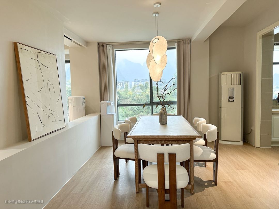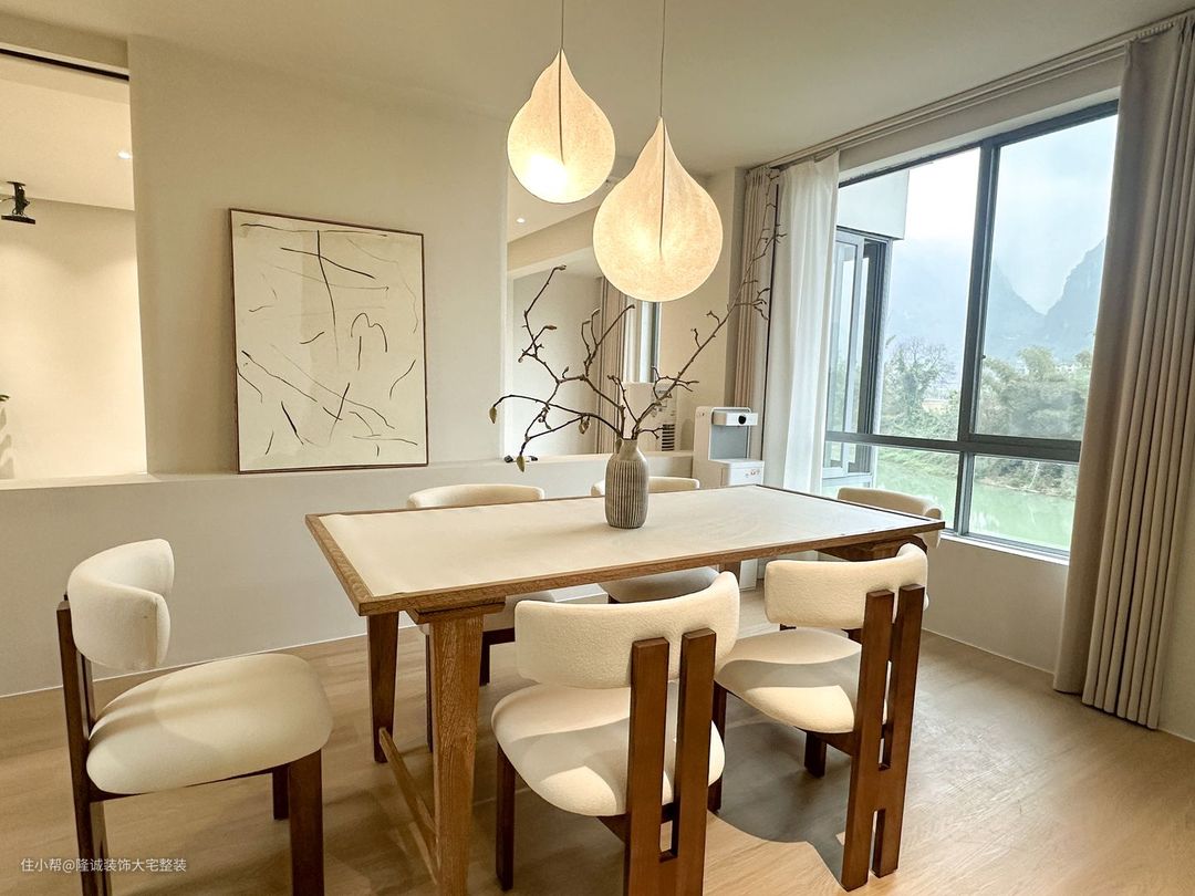 餐厅布置在客厅沙发后方,这一设计巧妙地利用了空间,同时也为两个区域之间的互动与联系创造了可能。浅木色的餐桌椅,与整个空间的原木风元素相呼应,呈现出一种温暖而自然的氛围。餐桌椅的线条简约流畅,不仅实用而且极具美感,为用餐空间增添了一份优雅与舒适。
