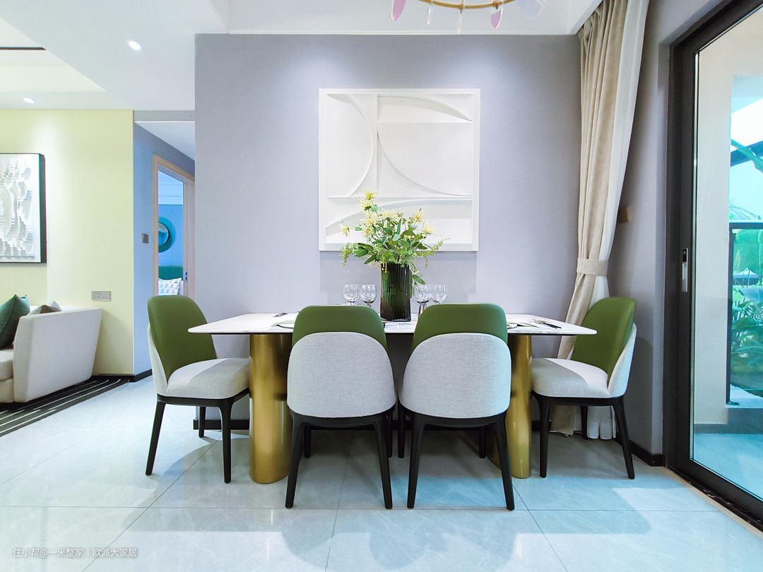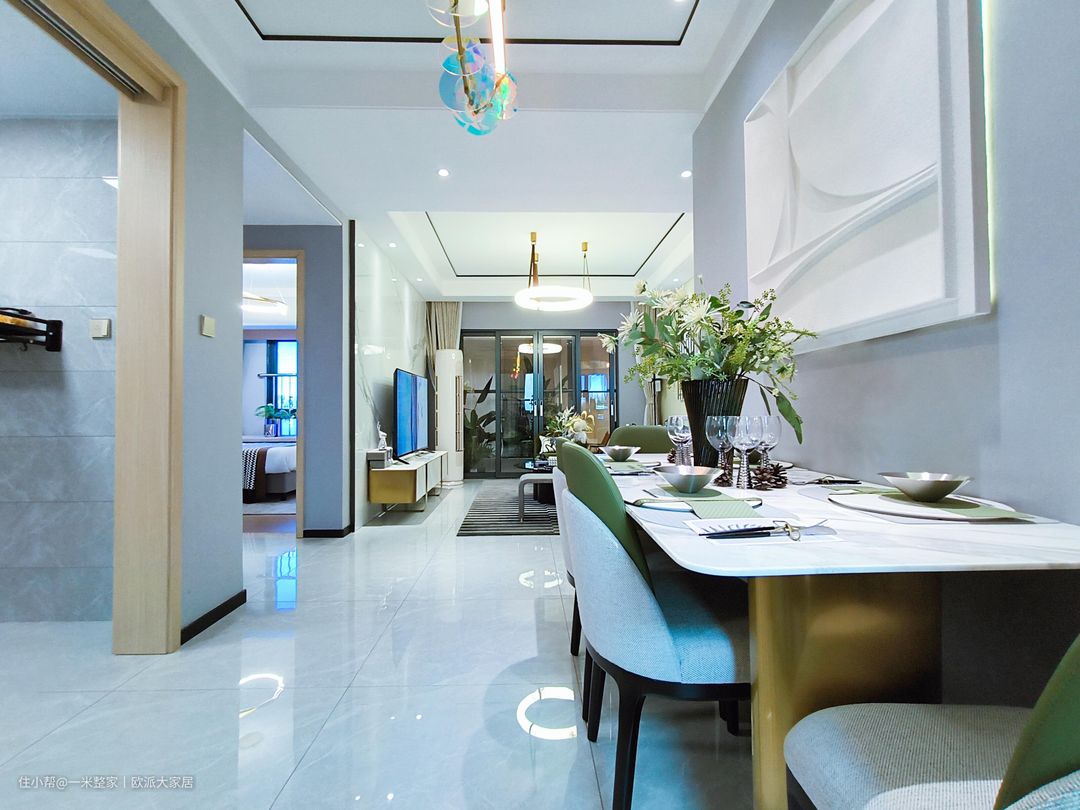 放置黑色大花瓶摆件和岛台上的芦苇干花遥相呼应 ,青花餐盘摆放整齐,颇有雅韵。 白色的皮质餐椅,可以同时容纳对人就餐,完美的诠释了屋主们对于温馨家庭氛围的期待,餐厅和客厅虽任处两个空间,但是生活氛围同样很温馨。餐厅位于厨房正前方,餐厨一体化,动线合理,大理石式的餐桌,挂置的是大气水晶灯,就餐更加有仪式感! 浅色的亮面瓷砖、白色的墙面,颜色搭配简约而富有层次感,构成餐厅的底色,奶油色餐桌椅靠墙放置,餐桌上方从而增加空间的丰富性,