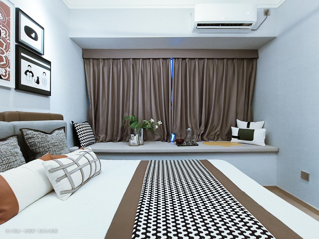 主卧延续了简约风的设计,整体色调以卡其色+白色,再搭配上深色的遮光帘真的很适合休息。飘窗不能砸索性就打造成喝茶聊天的休闲区,作为男女主人平时假日时刻的休闲角。 主卧飘窗还是一处天然的收纳空间。将杂物有序地摆放在软垫上,既能保证空间整洁美观,又能让家居环境更加宜居。布艺软垫布置飘窗作为一方小小的休闲角落,让主卧的空间利用更加完善。 卧室的床品设计采用了卡其色的装饰,整体色调保持着一致性。顶部的吊灯,在夜晚时为阅读提供了充足的光线。左侧深色的床头柜,在白色背景墙的衬托下,更富有立体感。顶部的射灯和吊顶,则为整个空间营造出了更为温馨的氛围。
