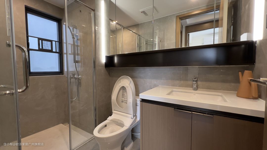 ① 卫生间干湿分离设计,中间选用落地玻璃门隔断,即保证光线又能避免各功能区互扰 ② 定制镜面壁龛和洗手台下柜,增强收纳能力,保证空间的干净整