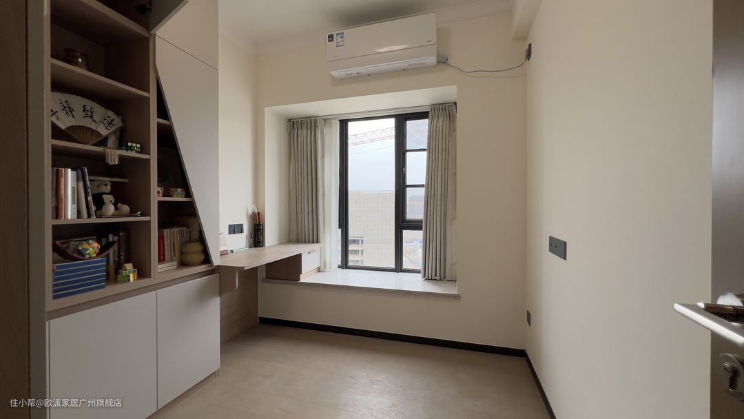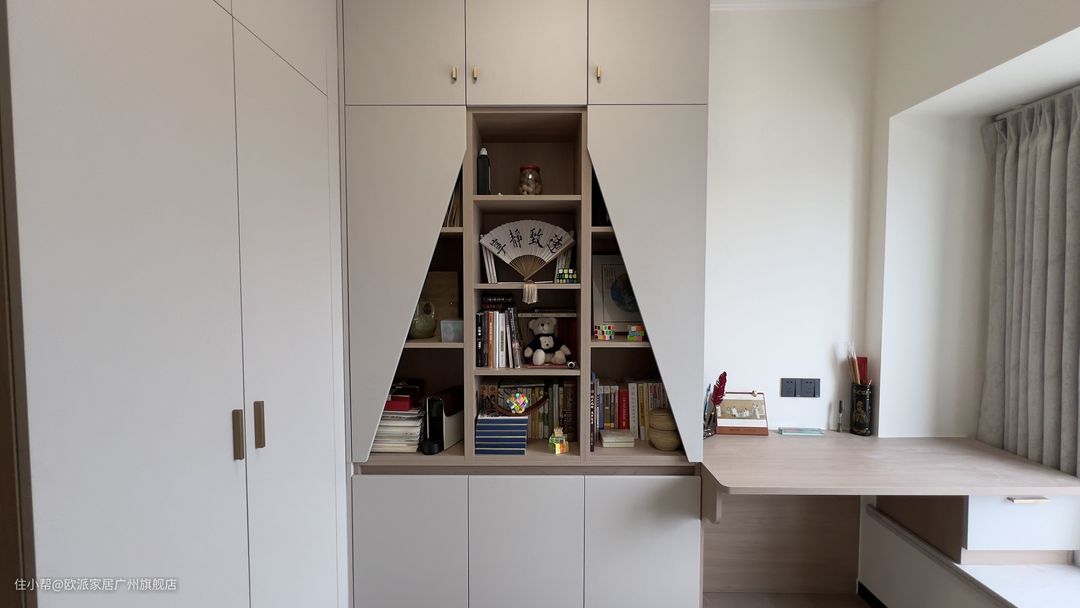 ① 次卧目前规划为书房,预留了床位,以后可以改为孩子的儿童房 ② 靠墙定制衣柜+书柜一体,顶天设计,书柜做造型设计,规划开放格+封闭柜,藏露有序开放格放置常阅读的书籍和观赏摆件 ③ 书桌旁连接台面和抽屉,秒变书桌&办公桌,抽屉也能收纳随手需要的小物品,充分利用空间的同时也增强了收纳能力