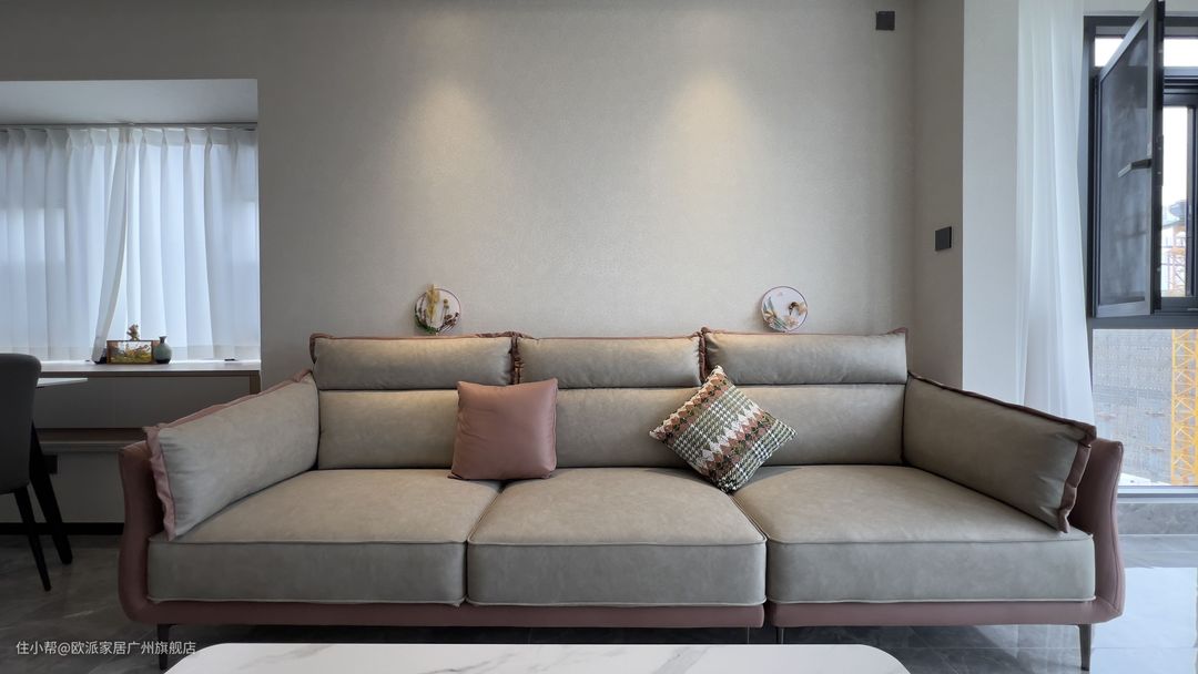 ① 客厅与阳台打通,通铺同一款式的反光板,让空间更加通透宽敞,设计拱门,添置透光窗帘,即保证光线又有隐私 ② 靠墙定制落地电视柜,下方不易产生卫生死角,四个大抽屉大大增强收纳能力,台面摆放插画或者盆栽,增加生机感 ③ 选择浅灰色的沙发,让整个空间调性更加协调统一