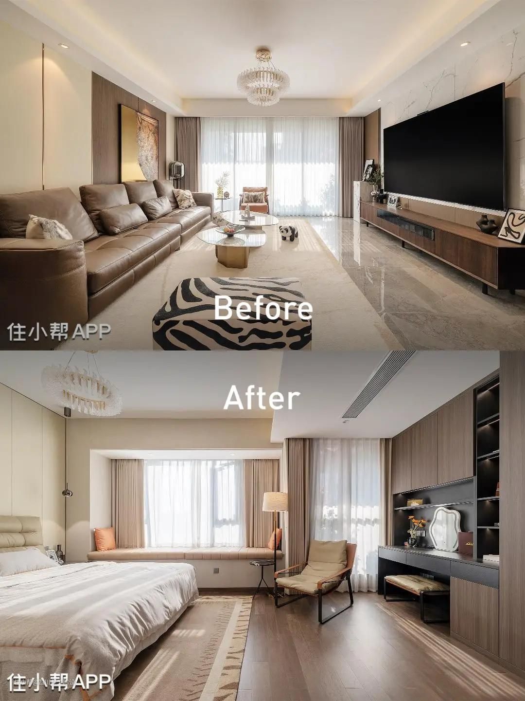 软装部分在沙发上下了许多功夫,整体围合式布局,两侧放置懒人沙发和沙发椅,随坐随躺,中间选了一款棕色的皮质沙发,触感亲肤,造型方正大气,氛围温馨有品质。 茶几虽然是主流的组合茶几,但款式选了一款不规则岩板桌面+金属多边茶几腿的组合茶几,在外形上颇有艺术感,有棱有角又不显尖锐,同时也符合这个客厅轻奢典雅的氛围。 后面的墙面同样利用了护墙板,增加空间隔音,将木饰面和白色护墙板交错拼贴上墙,中间用金属窄条装饰点缀,高级感瞬间喷涌而出,右侧木饰面上还选了一款金属质感极强的装饰画做点金一笔。