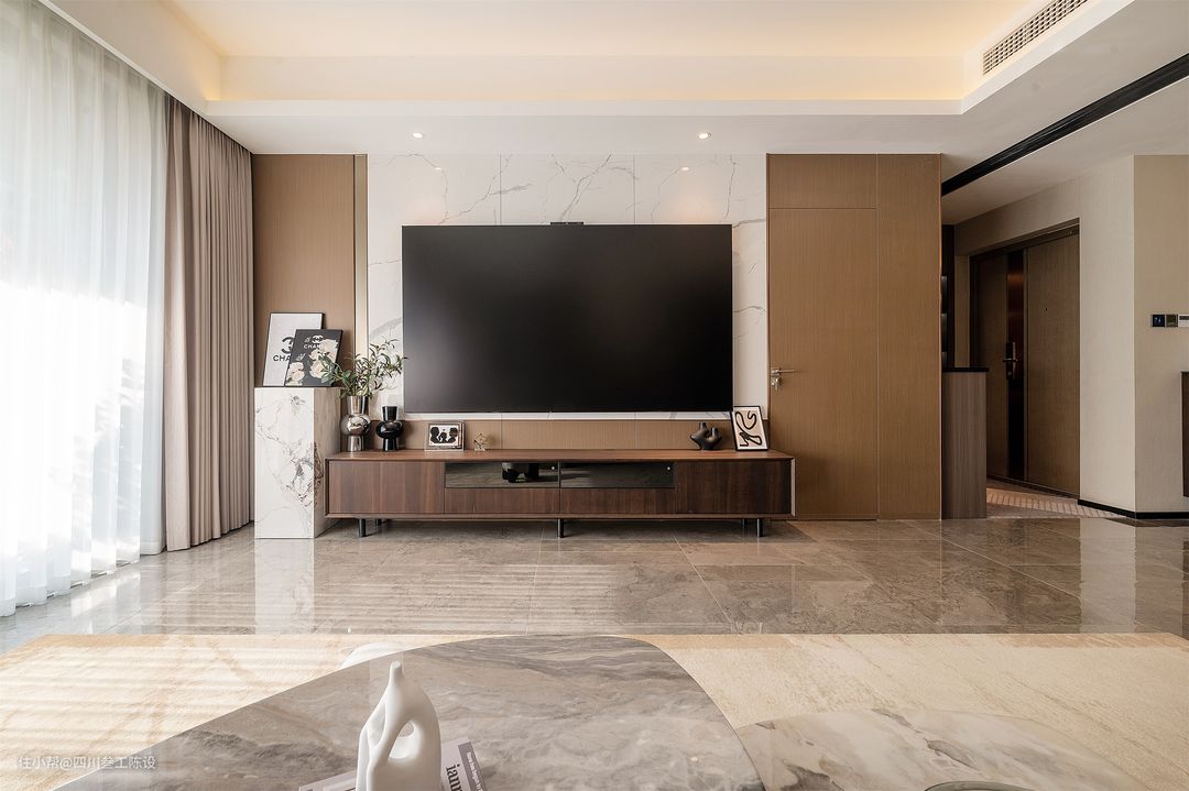 户主想要尽情享受大自然的包裹,所以保留了露天阳台,客厅与阳台中间安装玻璃推拉门做隔断,安装双侧窗帘,平时白色纱帘遮挡,透光不透景,更显温馨的家居氛围。 地面整体铺设灰色的亮面瓷砖,百搭耐看的款式和空间的主色调十分契合,空间不显违和,打理起来也方便,地面铺上一张宽大的米白色地毯,给予空间舒适的脚感,气氛也更加柔和。 层高适中,设计师安装双层藏灯吊顶,暖黄色的智能灯带映射在白色的天花上,显得整个空间更加如梦如幻,仿佛被阳光笼罩,中间的水晶吊灯更是将客厅的轻奢感带到另一个高度。 同时两侧的边吊也做了设计,设计师在沙发墙选用暖色小山丘射灯,电视墙则选用了光线更加柔和温馨的筒灯,空间明亮大气,无光照死角,氛围感十足。 电视墙的整个宽度是比较大的,只做纯色背景会显得比较单调,而且电视墙的右侧还有一个房间的入口,设计师按照墙面的木饰面做了同色同材质的隐形门,美观度更高。 中间挂电视机的地方使用的是岩板上墙,结实耐用,美观且易打理,左侧岩板与木饰面之间还用了金属条装饰。电视下方选了一个与岩板等长的木艺电视柜,底部留空,方便打理。