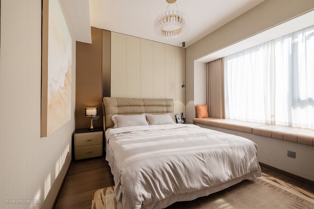 放床的的那边比较方正,侧面带有一个较长的飘窗空间,铺上软垫后整个空间更显温馨,颜色和米色窗帘很搭,闲暇时也可以坐在飘窗上看看窗外的城市美景。 吊顶和常见的设计不太一样,左侧做了边吊,主要是和床与衣帽间中间的悬浮式吊顶做衔接,里面也装有灯带增加层次与氛围的营造,与水晶吊灯搭配更彰显轻奢质感。 床头背景墙的设计看似简洁,实际上使用了三种不同板材,简单的木饰面和白色护墙板中间用金属板材装饰隔开,曾哥空间层次分明,轻奢感强。 墙面简单刷灰色墙漆,简洁百搭,大气耐看,一副颜色淡雅的山水装饰画挂在正中,即清除了空间的单调感,还让空间的质感更上一层,显得更加大气高雅。