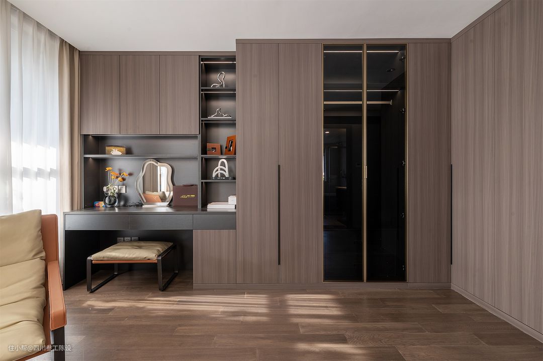 主卧的面积比较宽敞,户主也需要一个梳妆台,所以设计师通过吊顶的悬浮设计做了一个软隔断,再利用床下的地毯,从视觉上将俩边空间进行分割,看上去像是两个空间拼接在一起一般。 床尾按照户主的心意做足收纳,打造了一个衣帽空间和梳妆台,右侧安装L型顶天立地柜,色泽温润大气的木饰面搭配黑色的长条把手,更显大气质感。 中间适当的留出部分柜体使用了黑色透明柜门+金属边点缀的款式,更显品质与轻奢感,地面按“步步高”的拼法,不仅有着美好的寓意,同时也在视觉上有了延伸性,空间显得更加宽敞。 衣柜左侧做一体化设计,打造了一个梳妆台,黑色木制板恰到好处的做了一个穿插感的设计,增加两个空间的衔接性,上面还留出了开放格,增加层次,方便各种物品的拿取摆放。 插座方便各种电器使用,不规则的化妆镜是点睛一笔,在这规矩方正的空间中做变化,减少空间全由木质柜打造的单调和坚硬感,线条与氛围都更加柔和温馨。