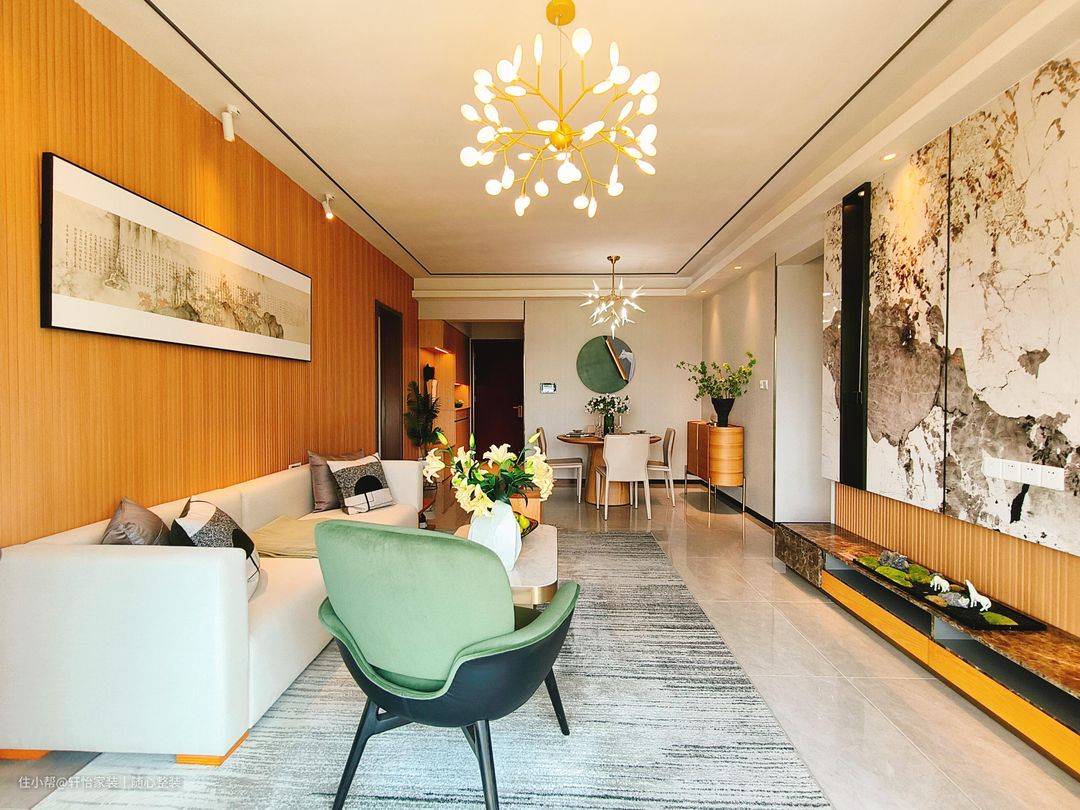 客厅采用边吊与射灯的搭配,可以发挥出重要的美化与空间塑造作用。射灯的光线投射在装饰画上,不仅能够突出装饰画的艺术效果,还可以增强空间立体感,使整个空间更加通透明亮,呈现出开阔的整体格局。 背饰板采用花纹拼接设计,以不规则的大面积花纹营造出随性简约的氛围。底部木质格栅对墙面空间进行了分割,使得层次更加分明。茶几上摆放着百合花,与整体氛围相融合。 背景墙选用的是淡雅柔和的原木色,这种自然温暖的色调与客厅整体的色调保持一致,一旁的同色系木质单人椅,其自然的色泽和纹理,彰显了原始质朴的木质之美,进一步强化了空间的温馨氛围。米白布艺直排沙发整体靠墙摆放,凸显出宁静的氛围,为客厅增添了几分浪漫与优雅。