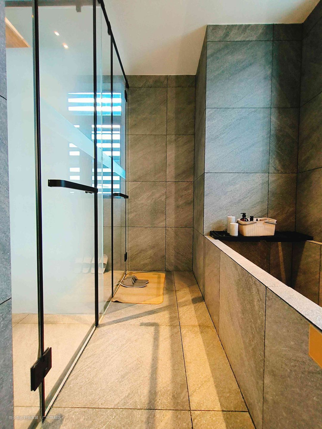 双人位洗漱台避免高峰重叠使用的局促,顶面倾泻而下的柔光,营造卫浴空间温柔氛围感。如厕区和淋浴区利用玻璃进行隔断,保持双区洁净干爽,同时使用也互不干扰。