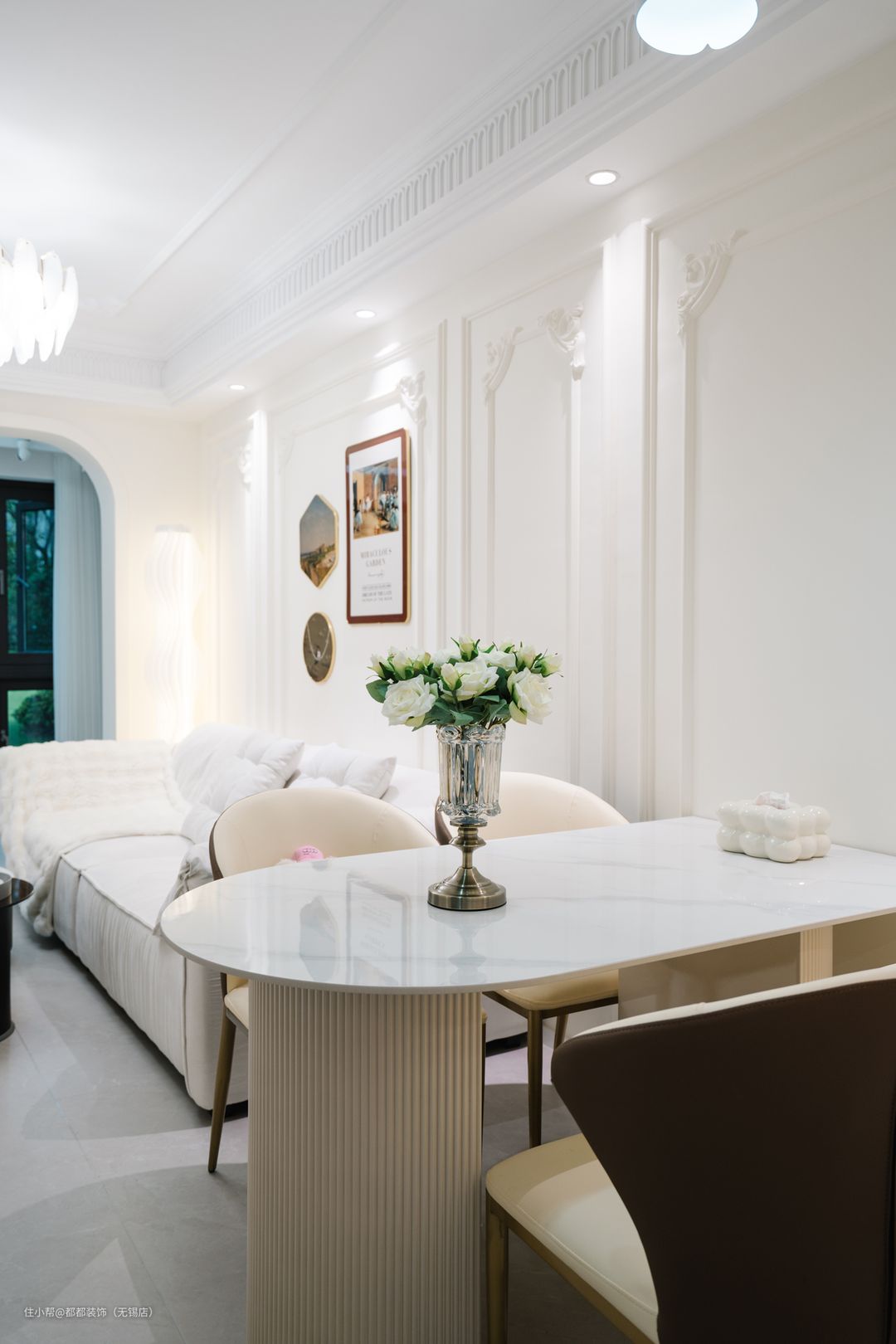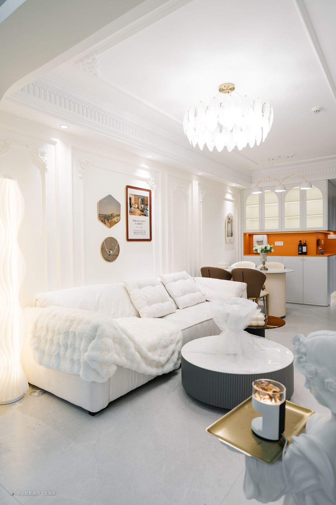 客厅以简洁温暖的白色铺垫,通铺柔光砖干净又显大,背景墙使用细腻的石膏线雕花装饰,切合了法式对称美学、雕花精妙、线条优美的特点;治愈奶油白依附着柔和的几何弧线,将法式风的浪漫与现代空间的简约融合,调和出客厅优雅简练的底色。 奶白色沙发尽显柔情与高级,进入客厅的那一刻开始,就仿佛跌入大团的云朵里,身心都变得治愈平和。当法式遇上奶油风,再融合多种现代元素,不失法式浪漫的同时,又如同与松软绵密的榛子奶油蛋糕撞了个满怀,治愈温馨触手可及。 弧度优美的拱形门洞建立起客厅与阳台流畅联动,大尺度落地窗,保证室内的明亮通透,圆弧造型的拱形门与石膏线条的结合,让硬装也能营造烂漫的装饰效果。一袭洁白的梦幻帘,将客厅所需的光照,调和至舒适的明度,阳光正好,微风不燥,岁月静好。 天使爱丽丝托盘雕像高级又精致,让人眼前一亮;整个客厅法式奶油风格弥漫着复古、自然主义的基调,不禁让人奔赴一场充满浓郁的艺术气息的“童话屋”。