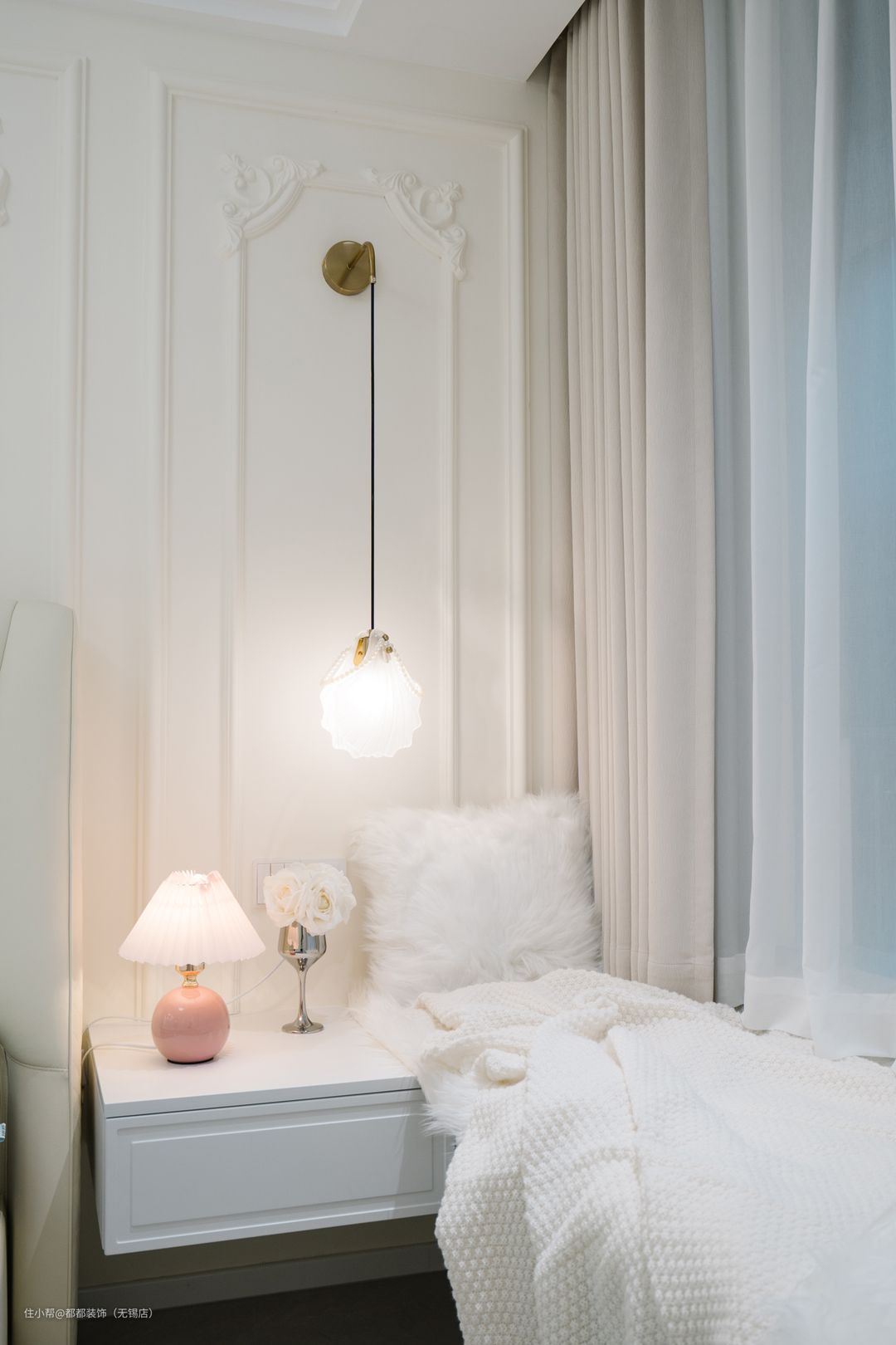 主卧延续了法式的纯粹,双眼皮吊顶与石膏线的结合,令空间简约不失层次感,弥漫着优雅的气息。没有过多的色彩和修饰,仅在床头放了一个水晶玻璃造型的落地灯,在夜晚点亮空间,少而精的元素让卧室拥有设计感的同时兼具舒适性。 飘窗铺上飘窗垫,放上小毛毯,沐浴着暖煦阳光、感受着清爽微风,嘬茶赏景、畅游书海、听乐观影,或就这么慵懒的躺上一躺,将心绪放空,漫享偷得浮生半日闲的自在,给自己一份清闲安静的松弛感。