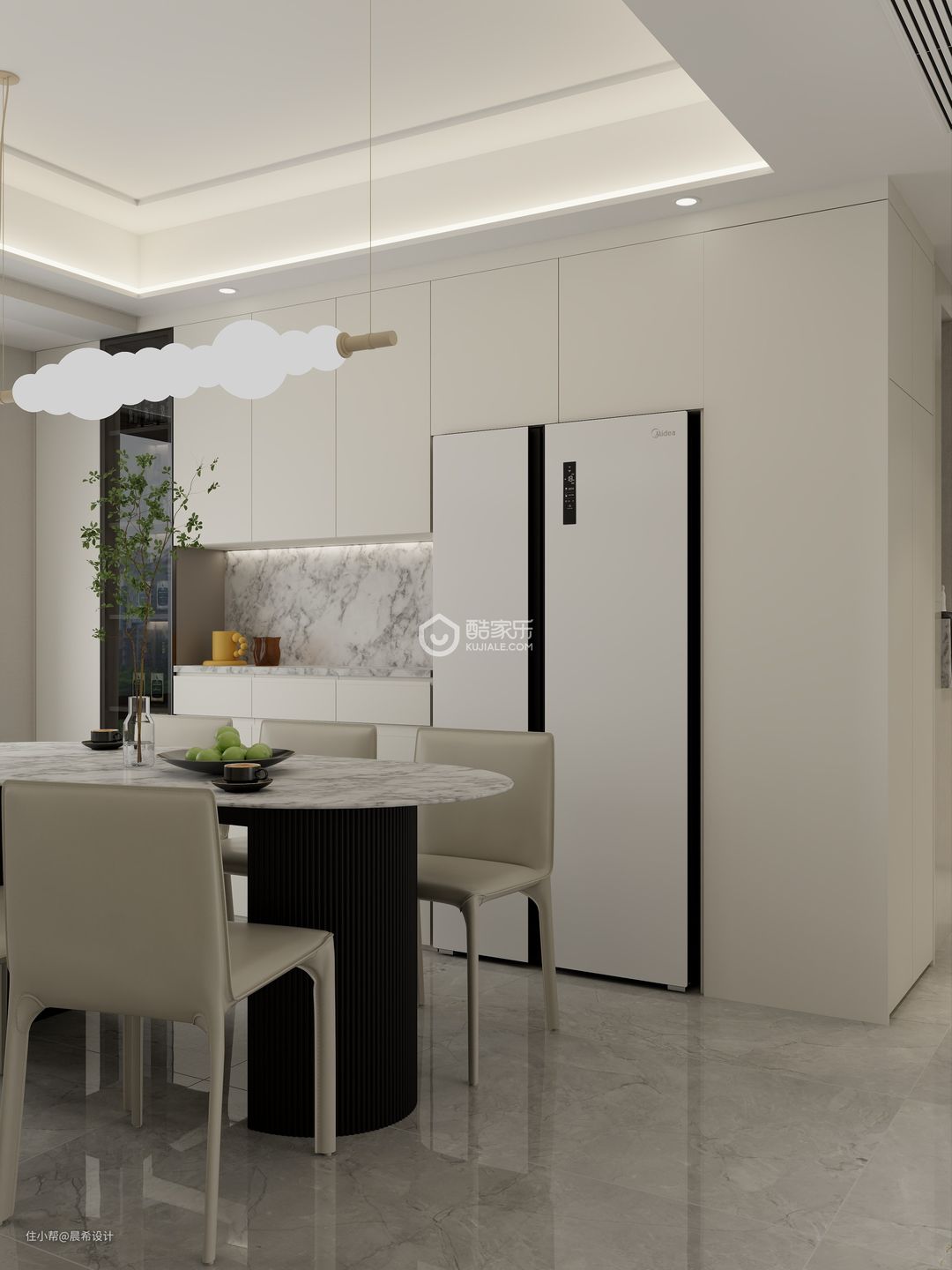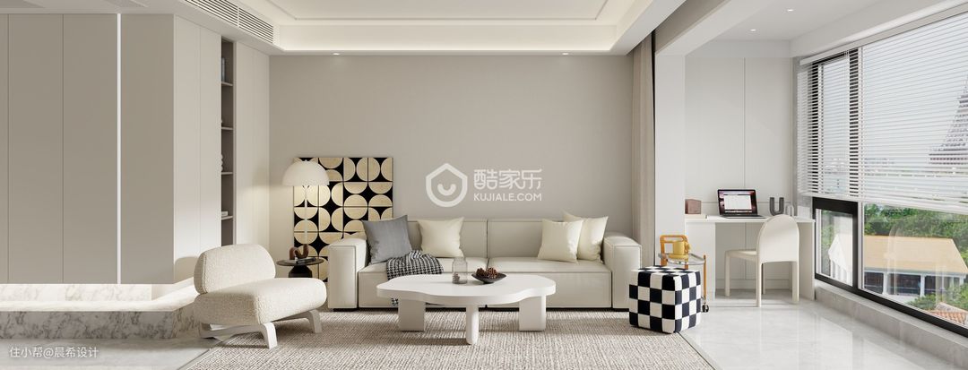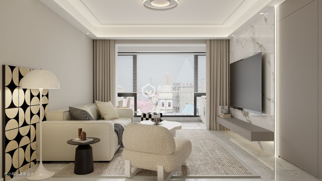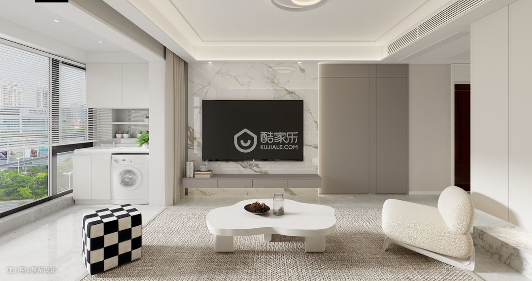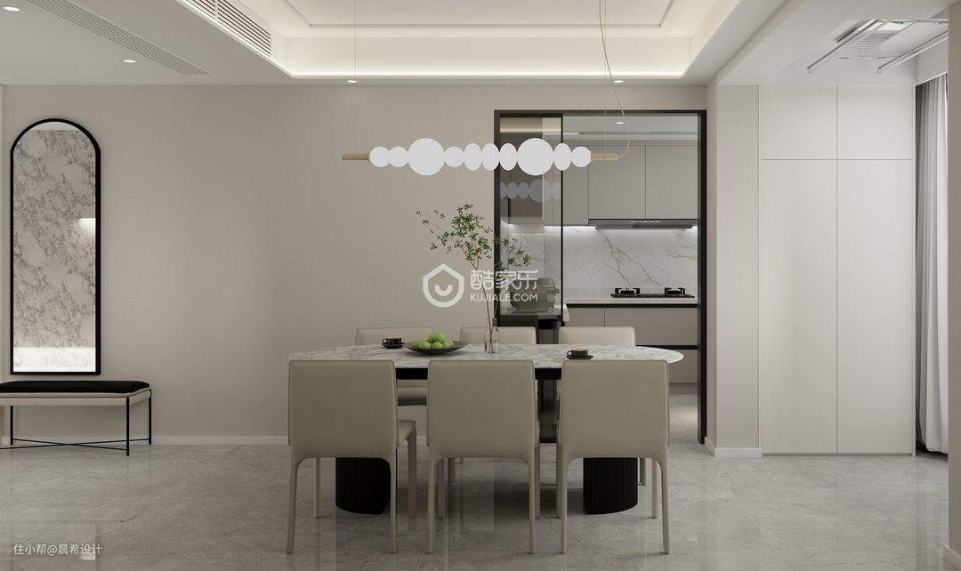 客餐厅空间这边电视背景为隐形门空间设计,石材背景饰面,整体空间设计简约有质感,增加整体空间的透气感觉;入户空间设计点睛,增加入户的美观度;l型柜体做延申,增加客厅的储物空间;