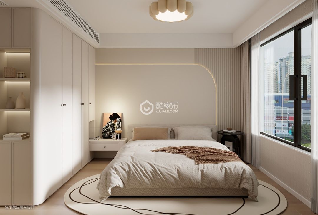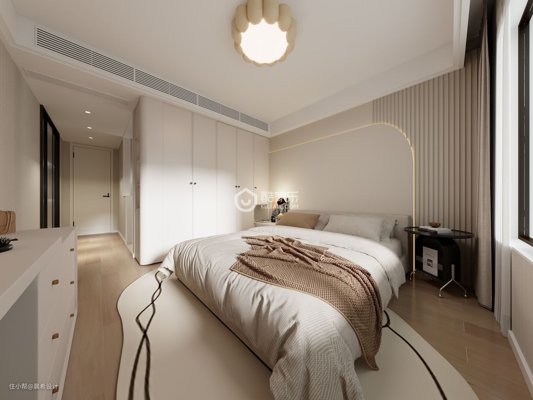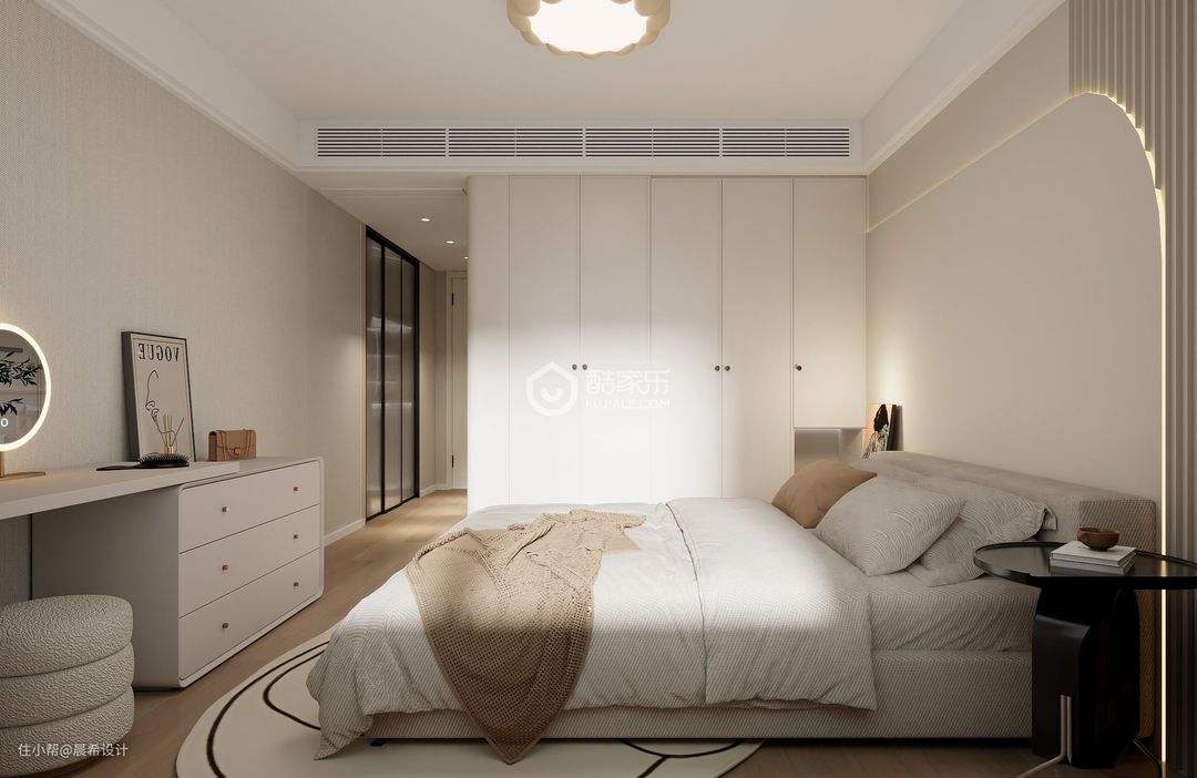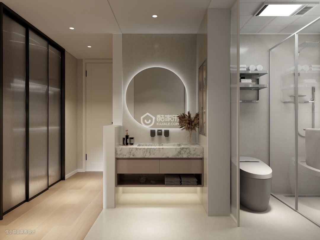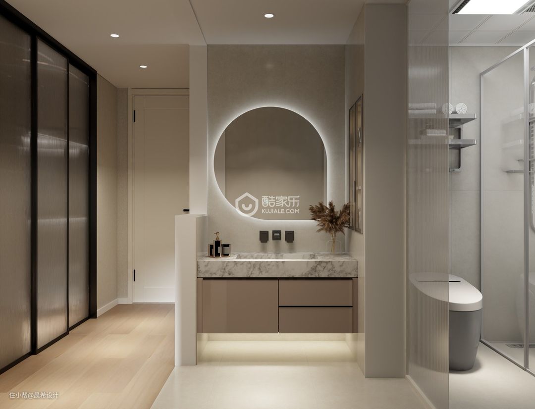 女儿房空间设计,衣帽间和卫生间为套房空间;卫生间空间干湿分离,增加了空间的功能使用感受;女儿房床头背景空设计圆弧元素,增加这个空间的柔性感受。