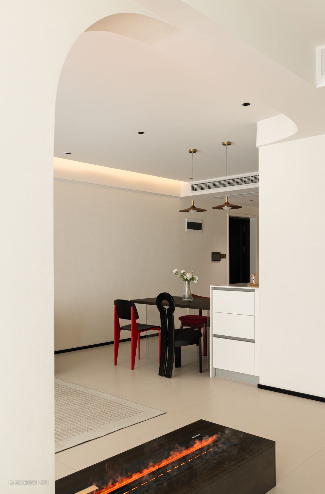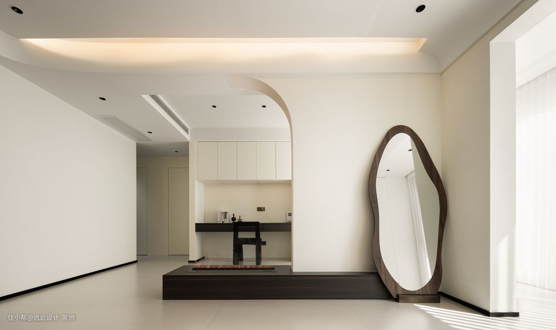 1、打通客厅与书房非承重墙部分,保留承重墙部分。用弧形打造成半开放式隔断,看起来更宽敞,同时弧形还柔化空间线条,增添了艺术感。 2、餐厨一体的设计,能够有效利用空间,减少不必要的隔断,使整个空间显得更加开阔和流畅。 3、整套房子在格局上没有太大改动,但是在视觉上更加显大,设计感满满。不过度装饰,恰到好处的设计与软装刚刚好~