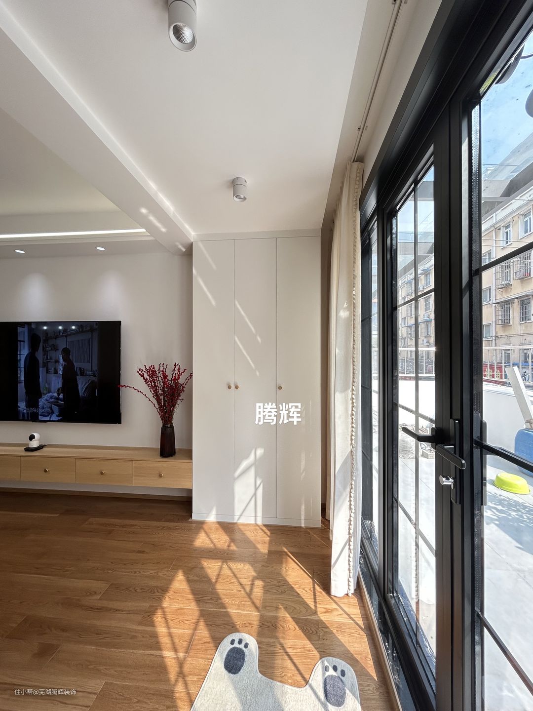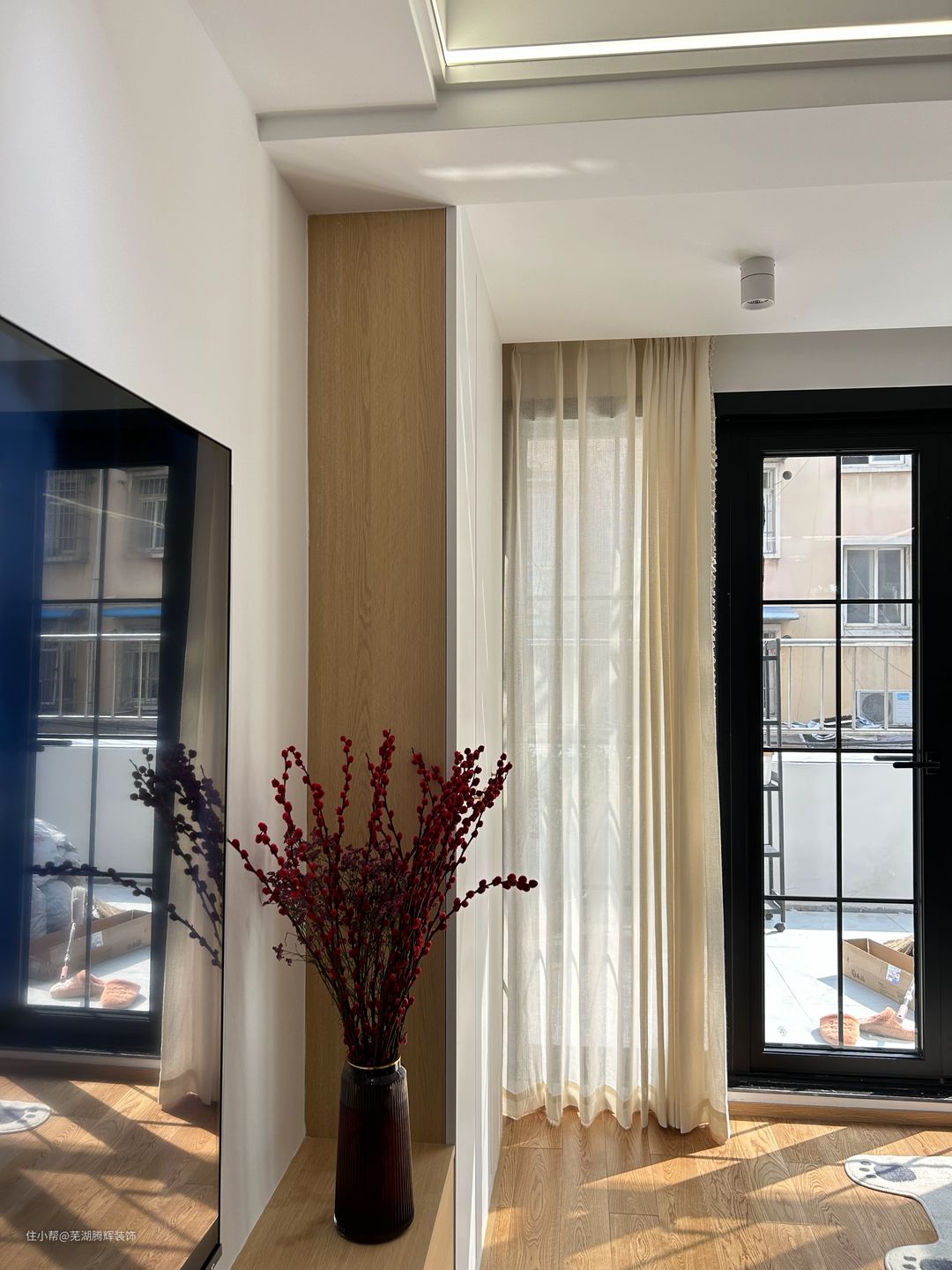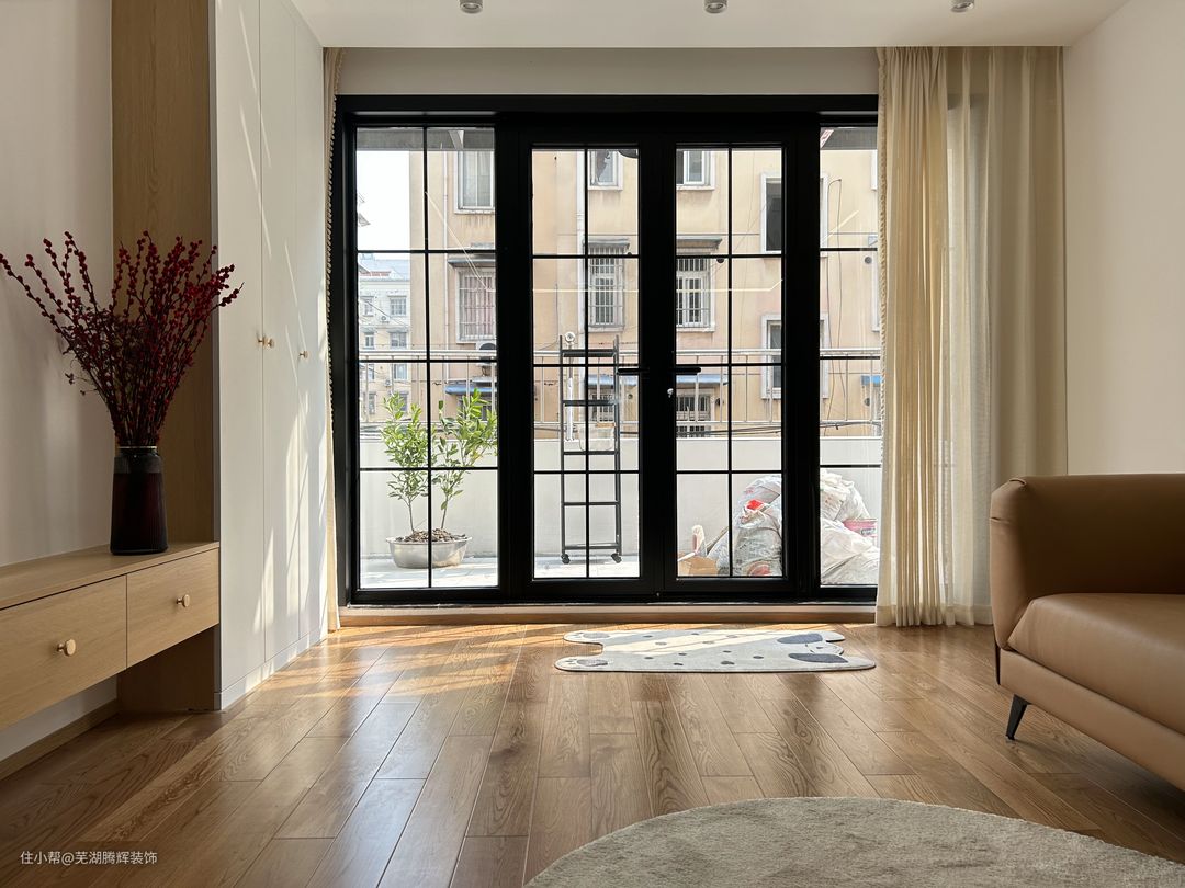 阳台外面有个露台,黑色三段的推拉门,好看又非常有质感,白色纱帘的搭配,营造唯美又舒适的居住环境。