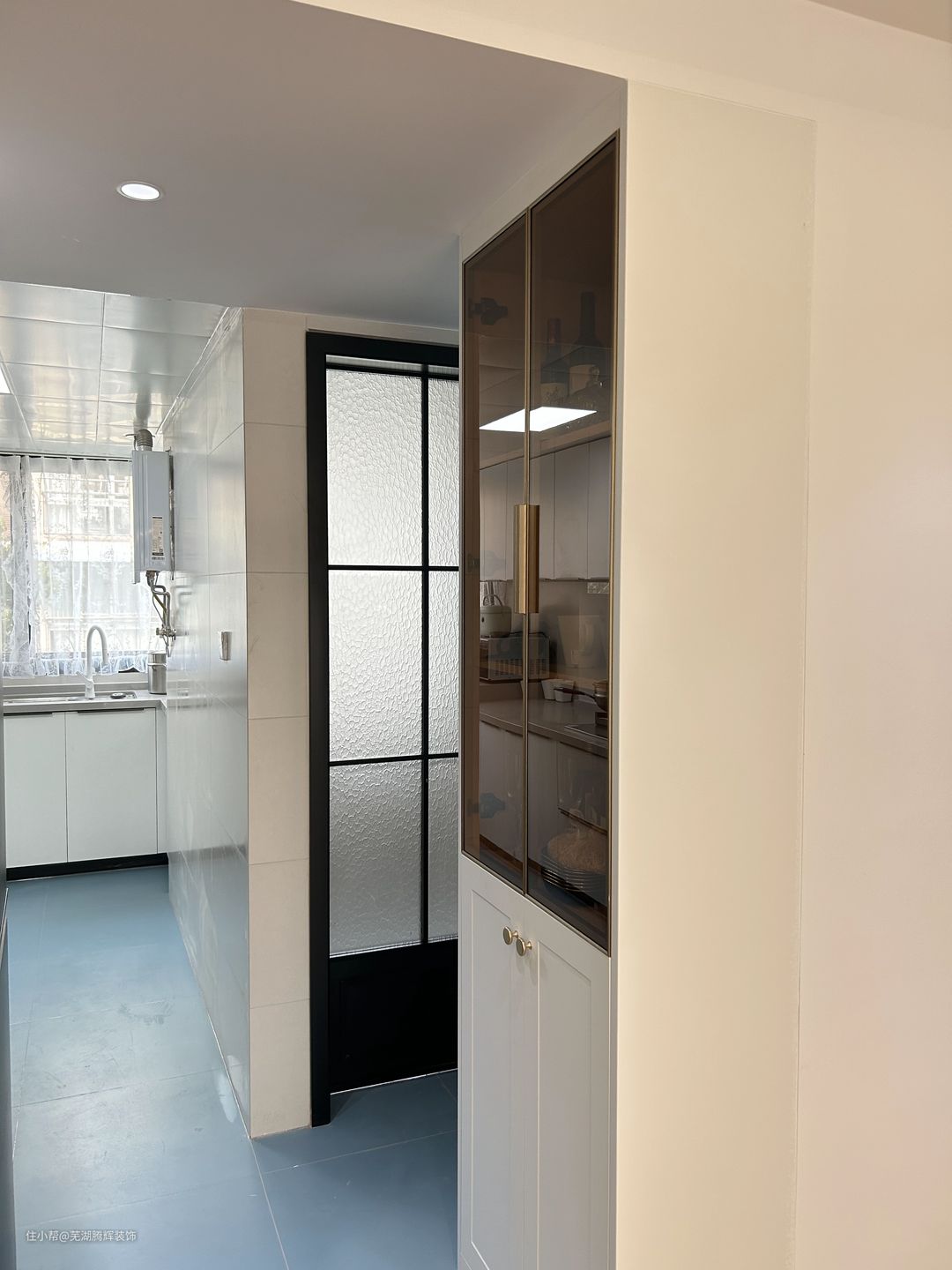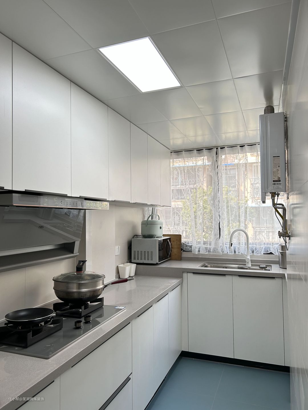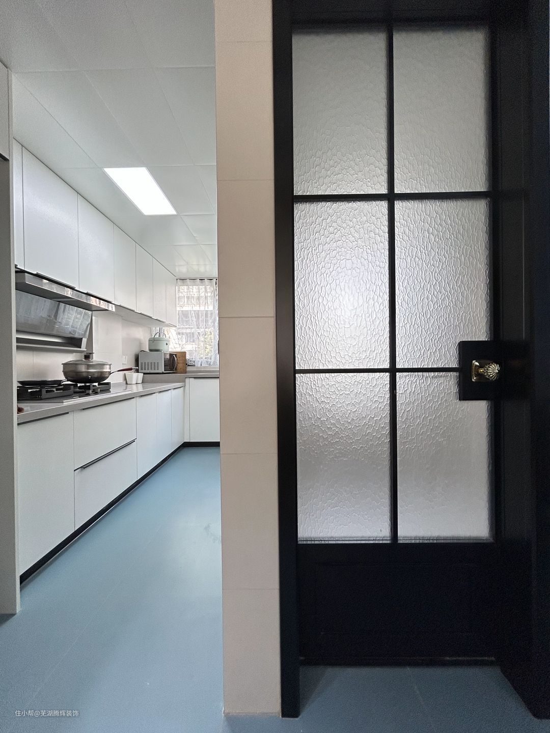 厨房还是以奶油白为主,搭配湖蓝色的地砖,好看又有层次感。吹贵无把手设计,整洁又干净。